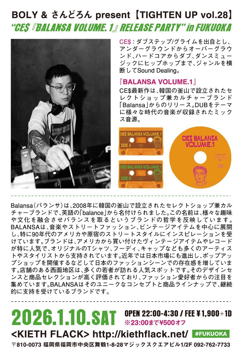 1.10 (SAT)1F! 【TIGHTEN UP 28 feat. CE$】 22:00~4:30 ¥1900+1D ★23:00まで¥500 OFF ■GUEST: CE$ ■DJ: DREAD光, p.co (SEXTANS), BORN, GOSK, BOLY ■VJ: north NADO ■DESIGN: NAOYA ARAKAWA #DUB #DUBSTEP #GRIME #ALTERNATIVE #TECHNO pic.x.com/cy8sSdc54E