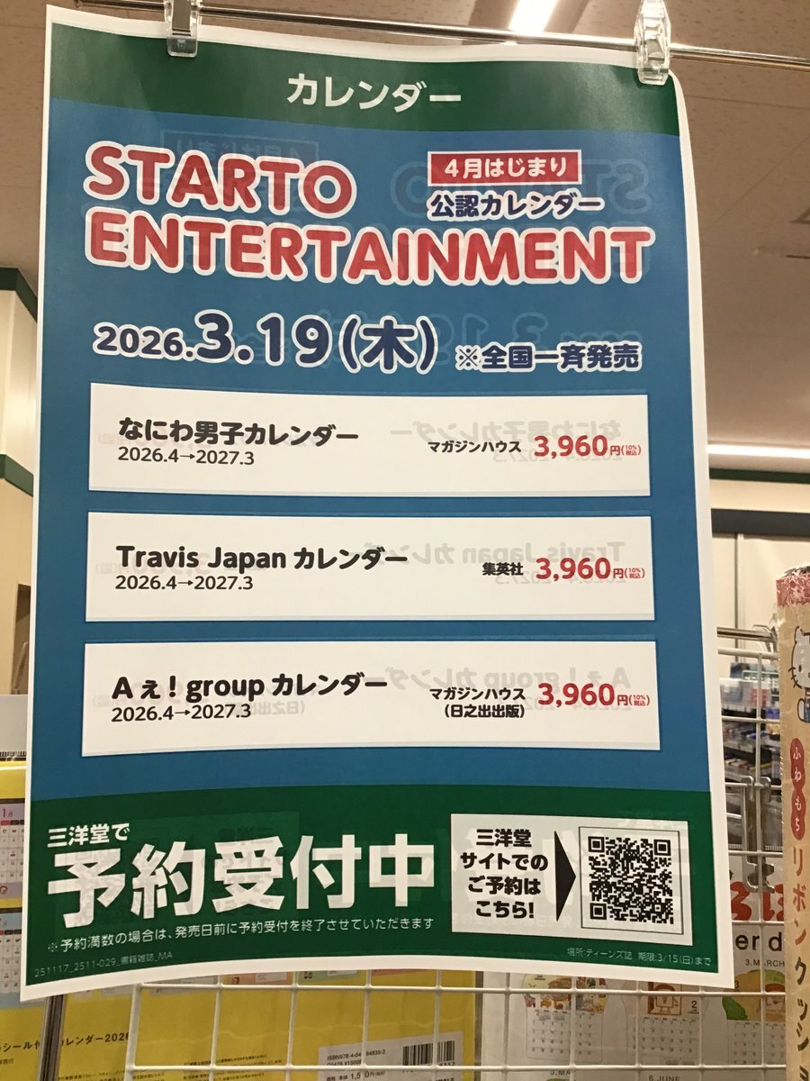 #STARTOENTERTAINMENT 公式カレンダー受付中❗️ 店頭・三洋堂サイトでのご予約承っております ご希望の方はお早目に! #SnowMan #なにわ男子 #TravisJapan #Aぇgroup pic.x.com/DnDRCKHo2V