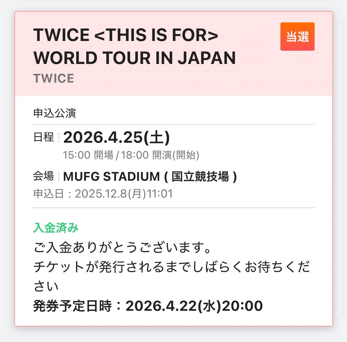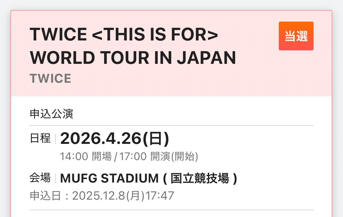 TWICE <THIS IS FOR> WORLD TOUR IN JAPAN 公演日:2026/04/28国立競技場 譲: ONCE JAPAN+ 長期会員先行(2枚) 求:定価+手数料+希望額の上DMお願いします。 #TWICE #TWICE当落 #同行者募集 #TWICE同行者募集 pic.x.com/3fbGLyPt7h