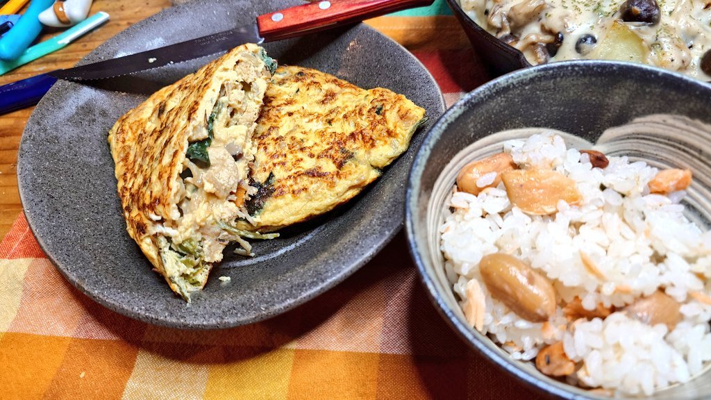 今夜の呑み処🍺あたしんち🍶 チキングリル~シチューのルーベースのホワイトソースで~ 卵焼き(空芯菜炒めの残りと切り干し大根煮入り) 落花生焼き鮭炊き込みご飯 ●欲望のままにまとまりのない晩御飯な日✨ (*´~`*)ウマウマ♪ #おうちごはん #Twitter家庭料理部 #晩酌 #晩ごはん #呑み処あたしんち pic.x.com/lVGyC0rRw4