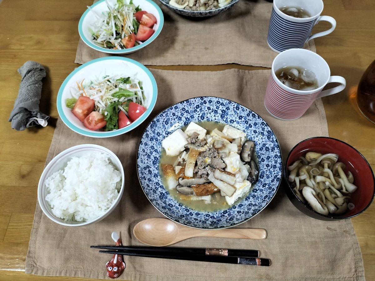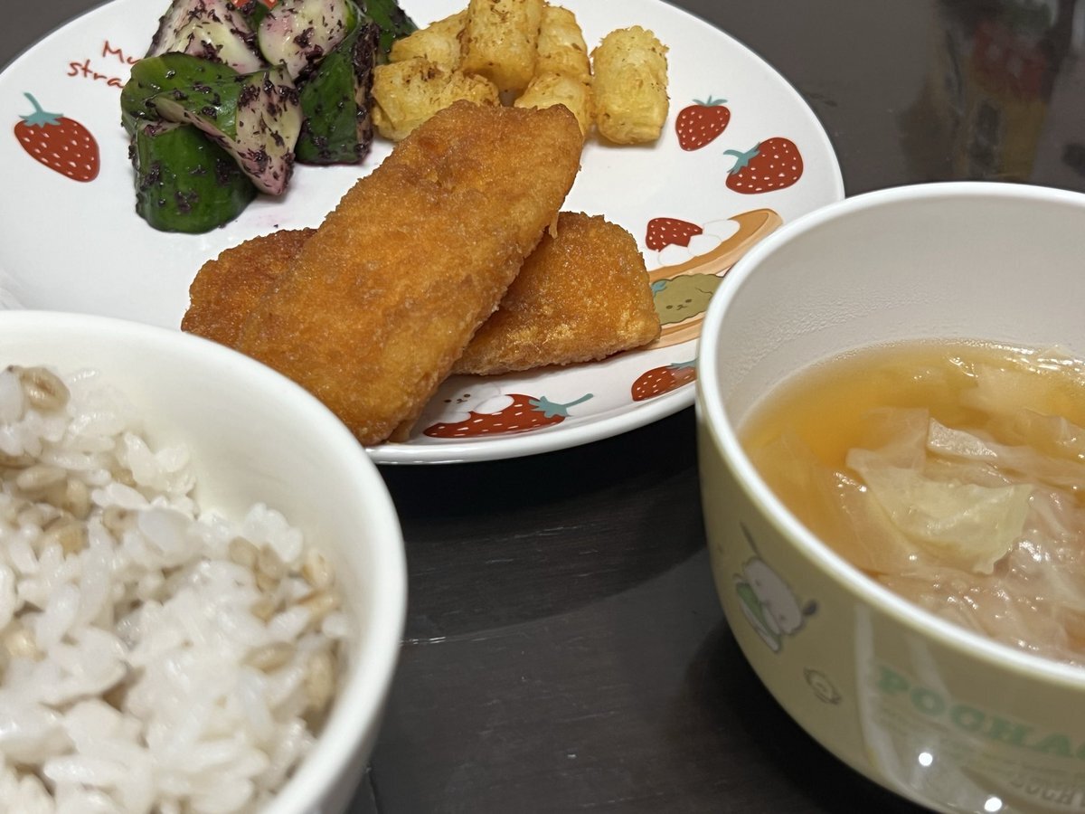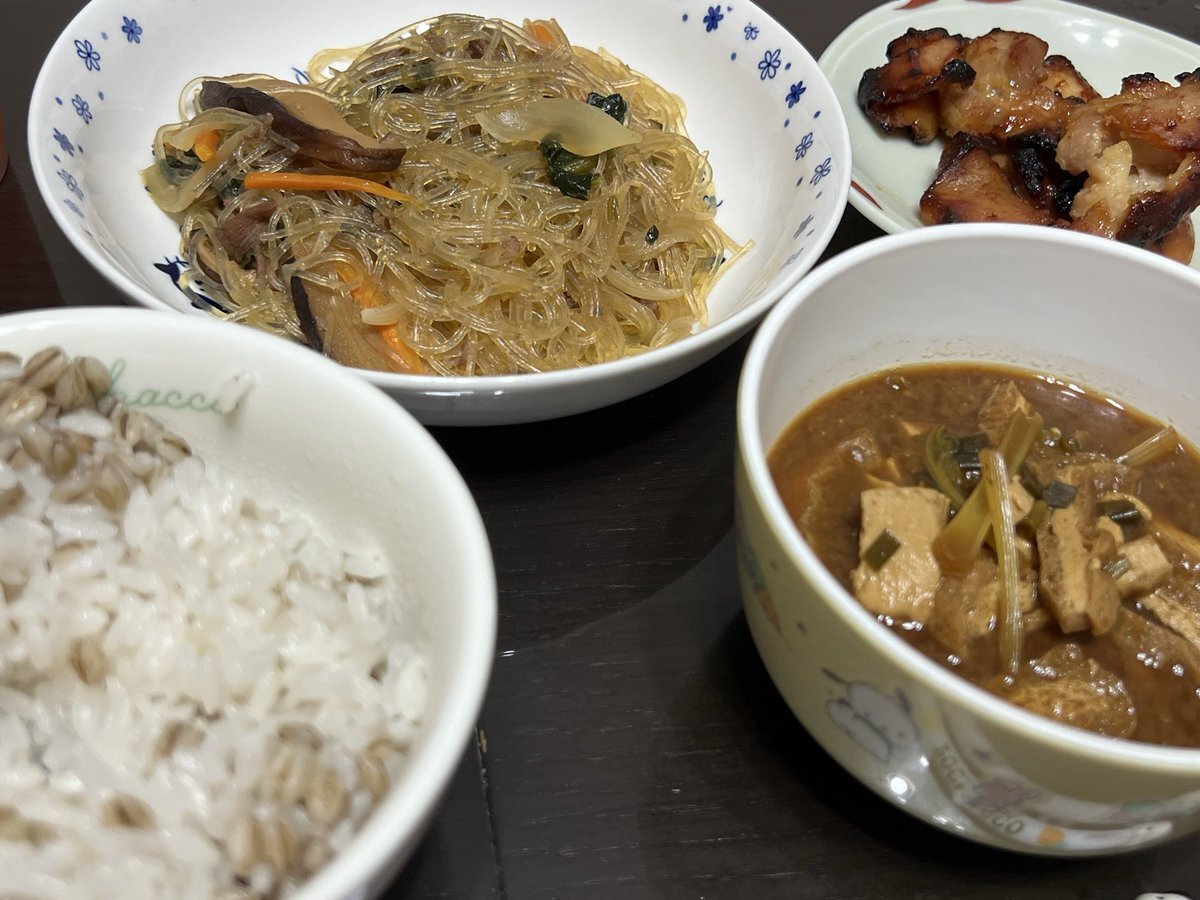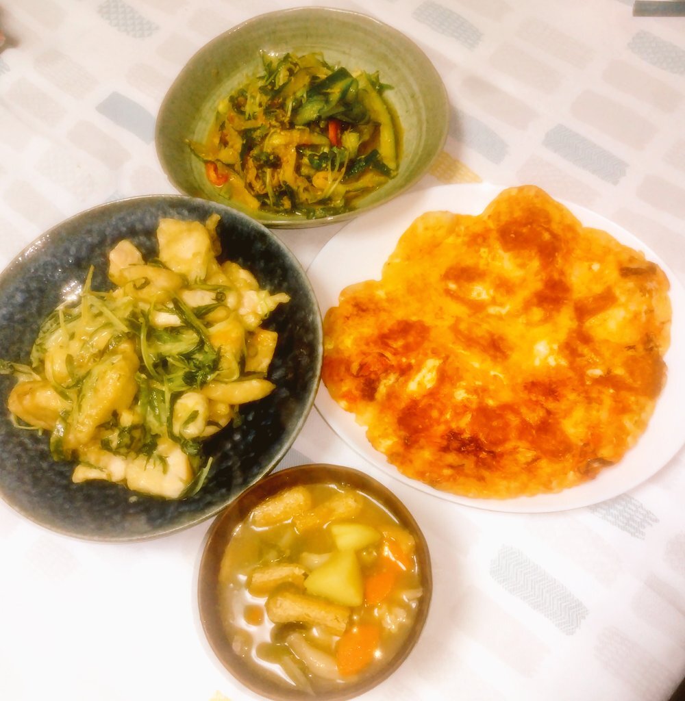 具沢山豚汁、かにかまときゅうりとかいわれの胡麻和え、鶏肉と水菜の柚子胡椒マヨ炒め、長芋キムチーズ焼き (´・Д・)」ごはんやでー #Twitter家庭料理部 pic.x.com/Tu5KophV6U