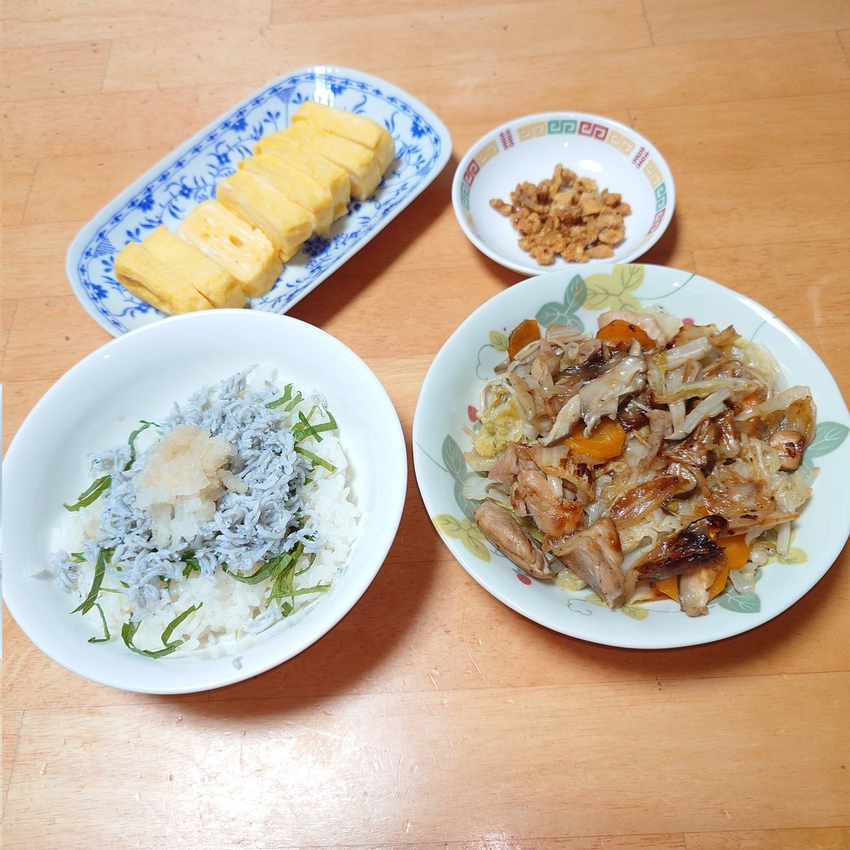 今日の #晩ごはん は、 ○しらす丼 ○鶏もも肉と白菜とあり物野菜の蒸し煮 ○卵焼き ○塩鶏皮 です。 #ねこちゃんくっきんぐ #おうちごはん #男子ごはん #Twitter家庭料理部 pic.x.com/cUdqJxJEzK