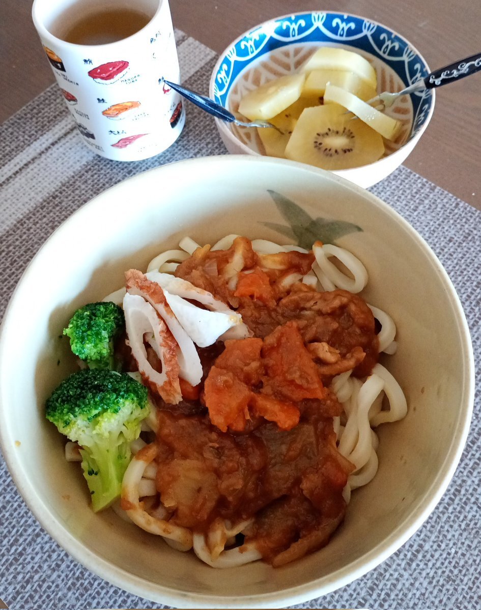 #Twitter家庭料理部 作り過ぎたカレーの消費… 少し具を足してカレーうどん 底には、麺つゆの出汁を敷設した シャツにカレー汁飛んで、今はパジャマを着てる…😅 夜は12/7の演奏会の練習ですね~ pic.x.com/GfDnf7MLSO