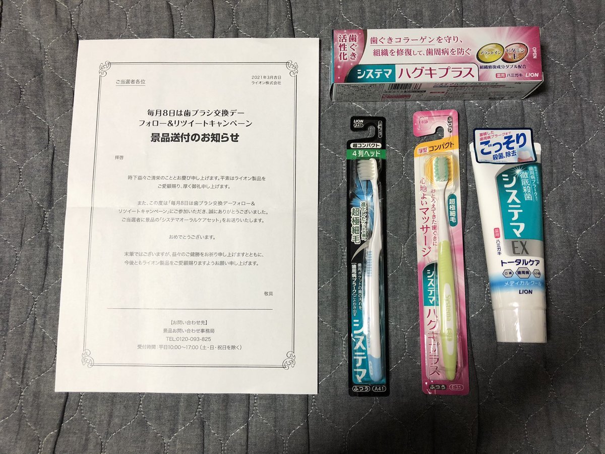 #毎月8日は歯ブラシ交換デー #Twitter懸賞 #当選報告 毎月8日は歯ブラシ交換デー様(@lion_haburashi )より、システマオーラルケアセットを頂きました😍 歯列矯正中で、本当に歯が命なので、とっても嬉しいです🦷❤️ ありがとうございます🙏✨ pic.x.com/V3RI52c80B