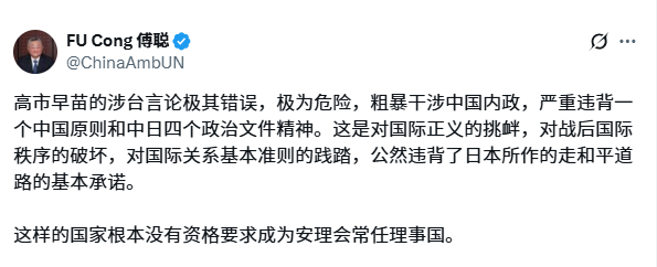 #Japan is "totally unqualified" to seek a seat as a permanent member of UN Security Council, Fu Cong, China's permanent representative to #UN 中国常駐国連代表の傅聡は、高市早苗氏の台湾発言は極めて誤っており、このような日本に国連安保理常任理事国を求める資格は全くないと指摘した。 pic.x.com/XwYbECg2Xn