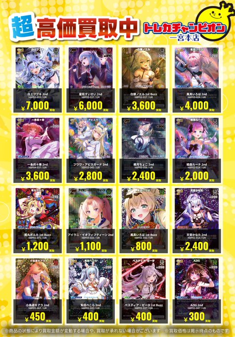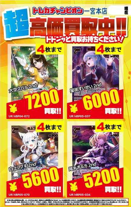 #ホロカ ✨高価買取情報✨ 【‼️12/21までの数量限定高価買取‼️】 ⚠各4枚まで⚠ UR #白上フブキ 2nd 5600円 ⚠️予告なく終了となる場合がございます ⚠️状態によりお返しとなる場合がございます ⚠️買取受付時間は9:00~21:00です #ビデアメ一宮買取表 #ホロ活 #ホロライブ #買取 #UR pic.x.com/vOTTVhVCG9