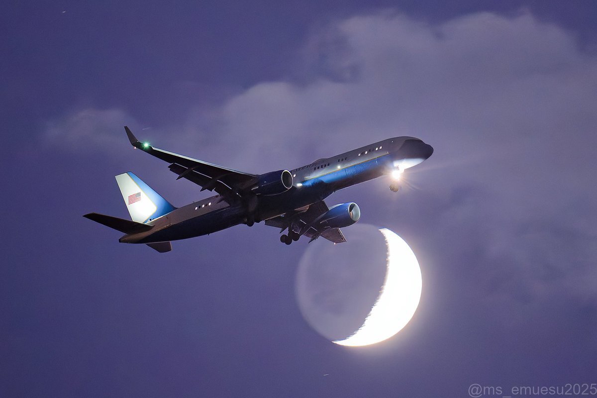 三日月🌙とC32A✈️ 本当はAF1で狙いたかった画ですが サイズバランス的にも 小ぶりな757でちょうど良かったです☺️🩵 たまには飛行機写真もアップ🙌🏻 #USAF #BoeingC32A #boeing757 #SAM47 #随伴機 pic.x.com/zGdbZMl8br