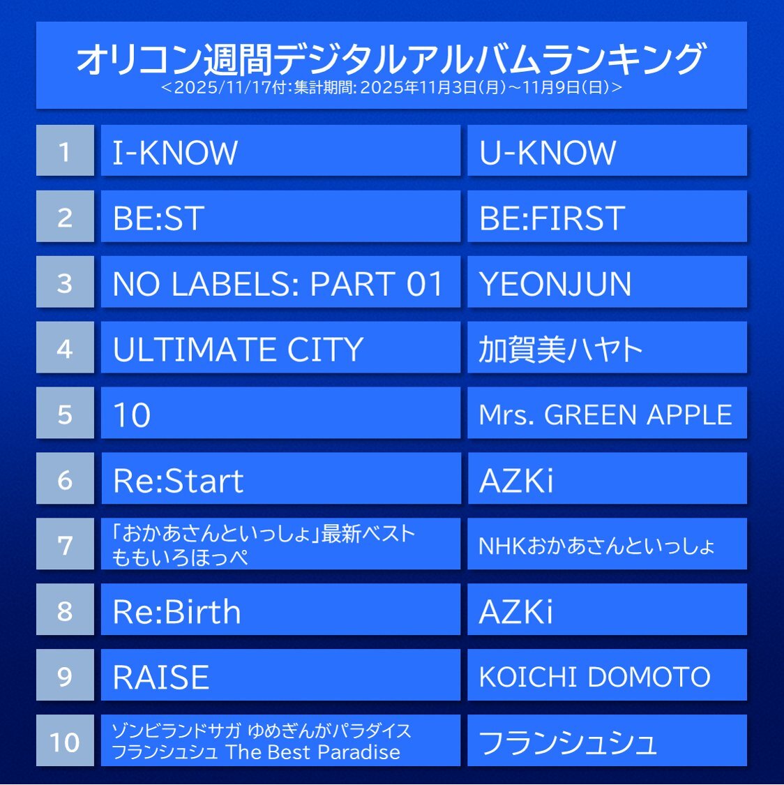 【オリコン週間デジタルアルバムランキング TOP10】11/17付 1位:U-KNOW 2位:BE:FIRST 3位:YEONJUN 4位:加賀美ハヤト 5位:Mrs. GREEN APPLE 6位:AZKi 7位:NHKおかあさんといっしょ 8位:AZKi 9位:KOICHI DOMOTO 10位:フランシュシュ . #オリコン