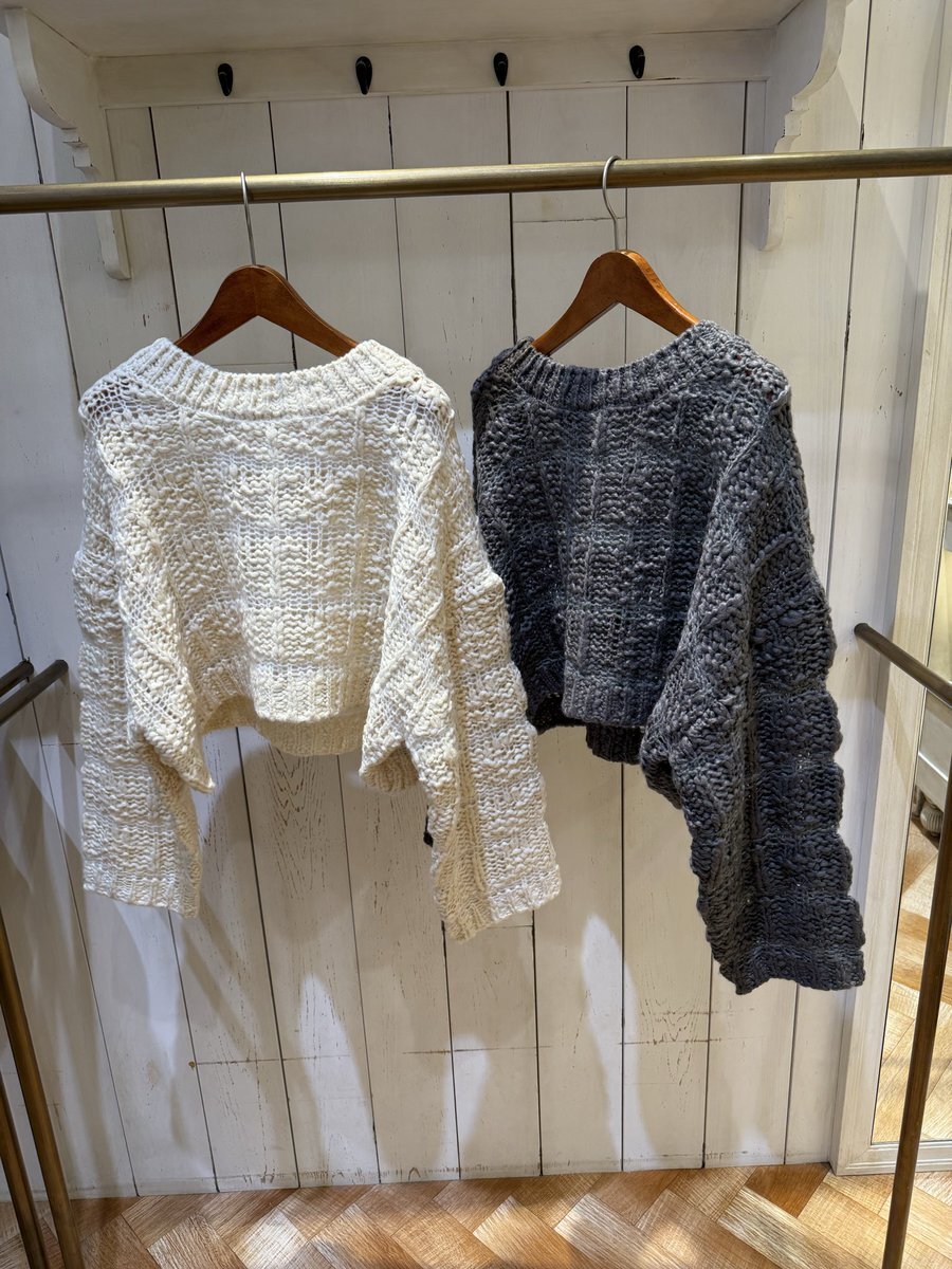 11/20 New🪽 #透かし編みデザインショートニット C.GRY/BGE ¥17,600 スラブ糸とふんわりとした糸をミックスした編地で、柔らかい肌触り☁️ ウエストにかかるくらいのコンパクトな着丈です! たっぷりワイドなバストと潔いショート丈のバランスが可愛いです🩷 #Ungrid #Ungrid金沢フォーラス店 pic.x.com/hBCuQFBgtm