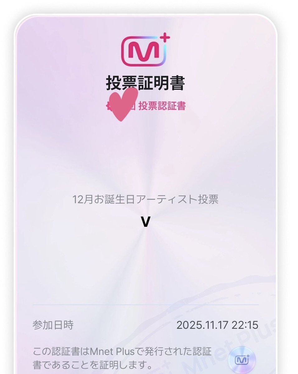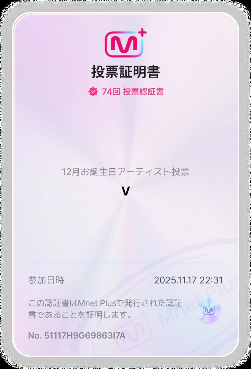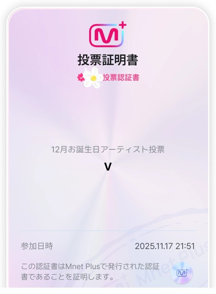 返信先:@taetaevoting_jp【Mnet】 ✔️11/24 🔚 🎂12月お誕生日アーティスト投票 #V テテに投票しました💜 pic.x.com/oOXzivNKSP