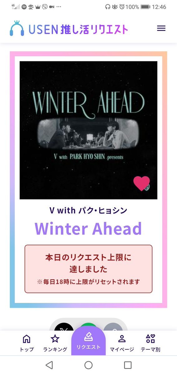返信先:@streamfortaejpn[Usen 推し活リクエスト] 11/17 📮テテの音楽をリクエストで応援💜 リアルタイム 📈 #V #WinterAhead #18🚨 📈#V_FRIENDS #98 🆘 デイリー 20アウト🚨 #V #BTSV キムテヒョン pic.x.com/hdxCpCFGYa