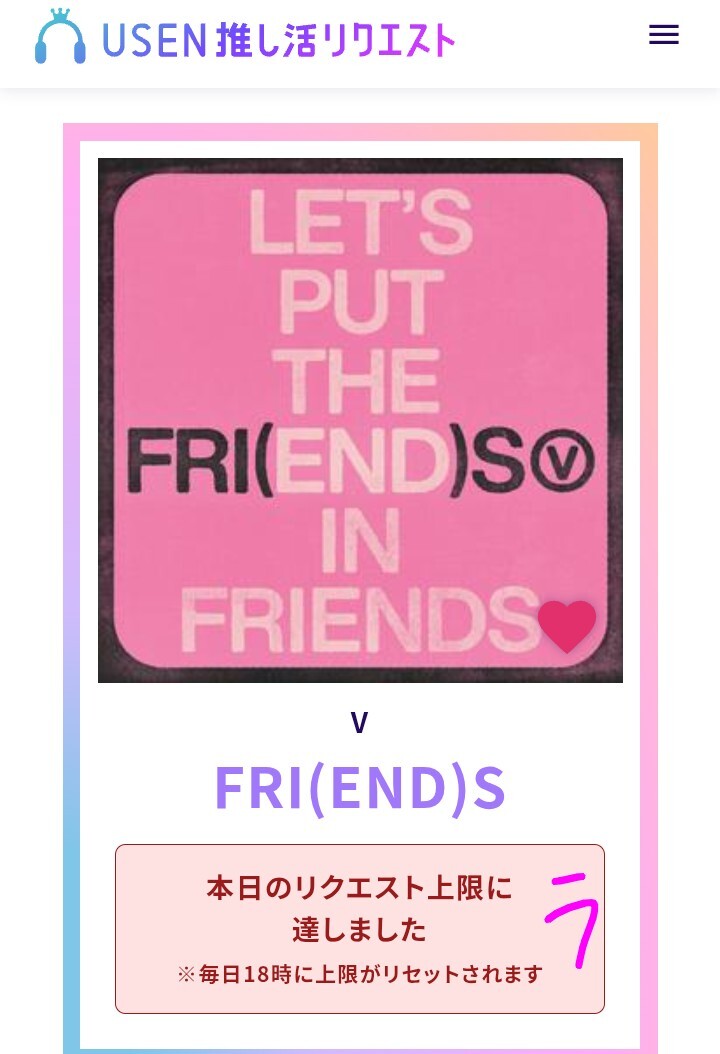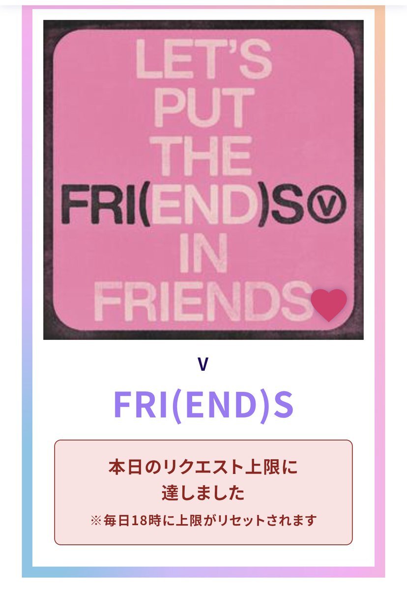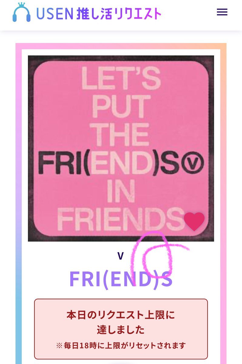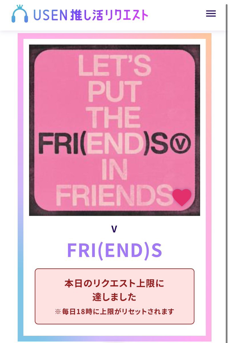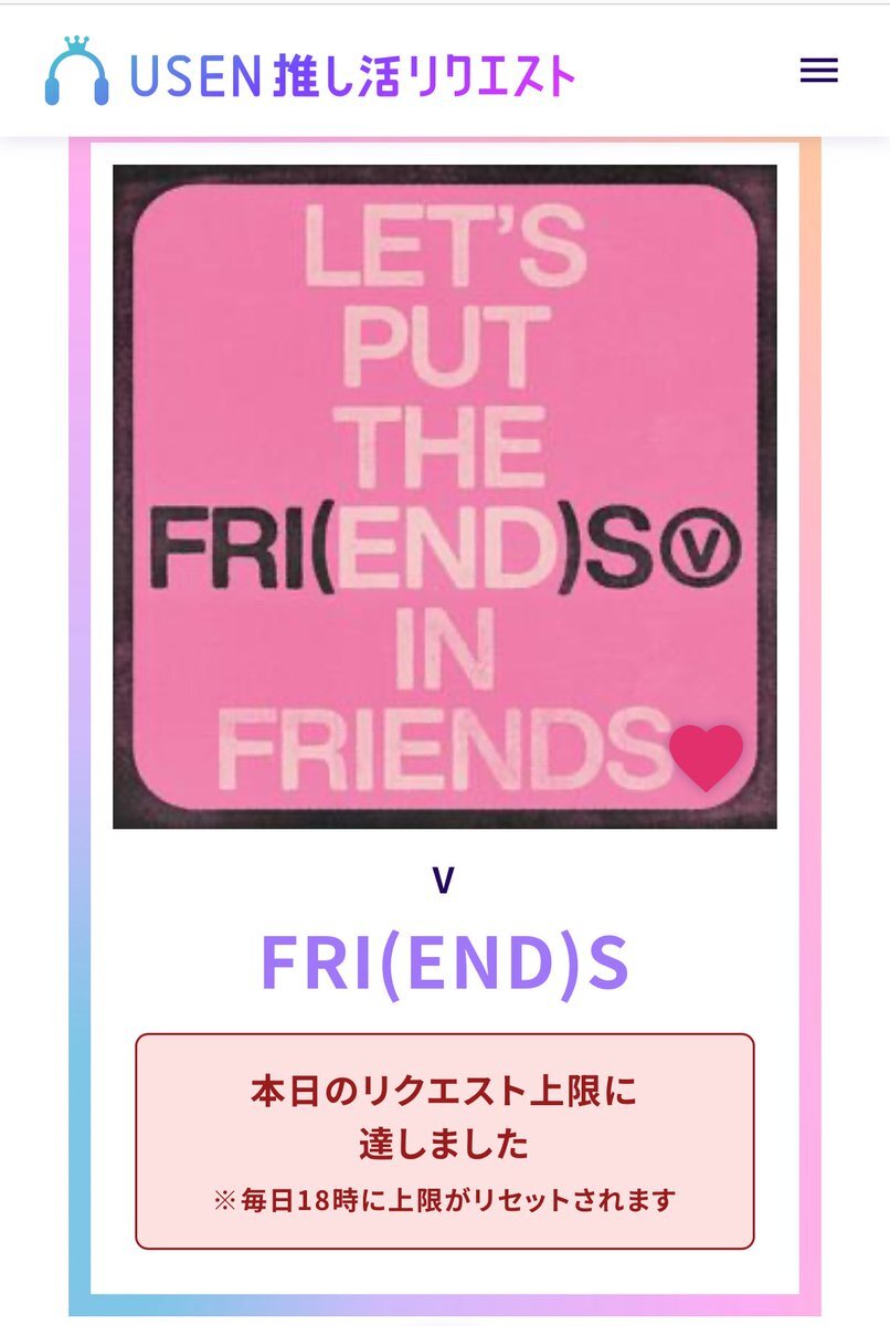 USEN 推し活リクエストでVのFRI(END)Sをリクエストしました🩷🐻! usen.oshireq.com/song/6374660 #USEN推し活リクエスト #推しリク #V