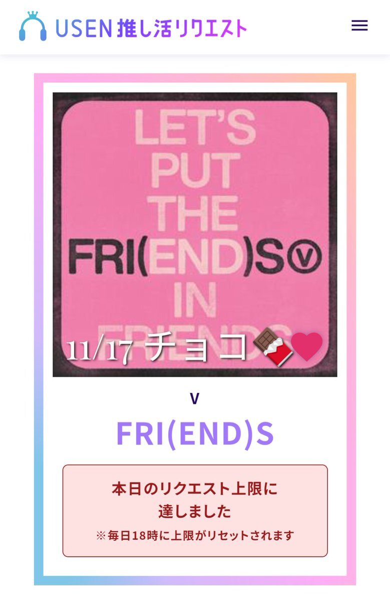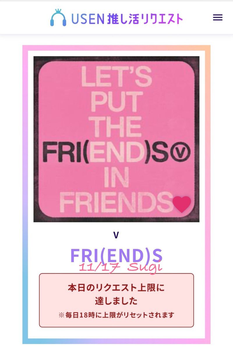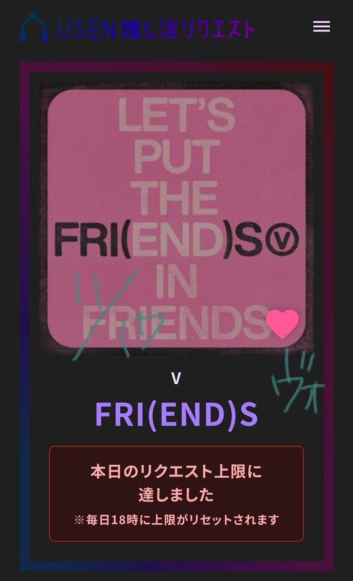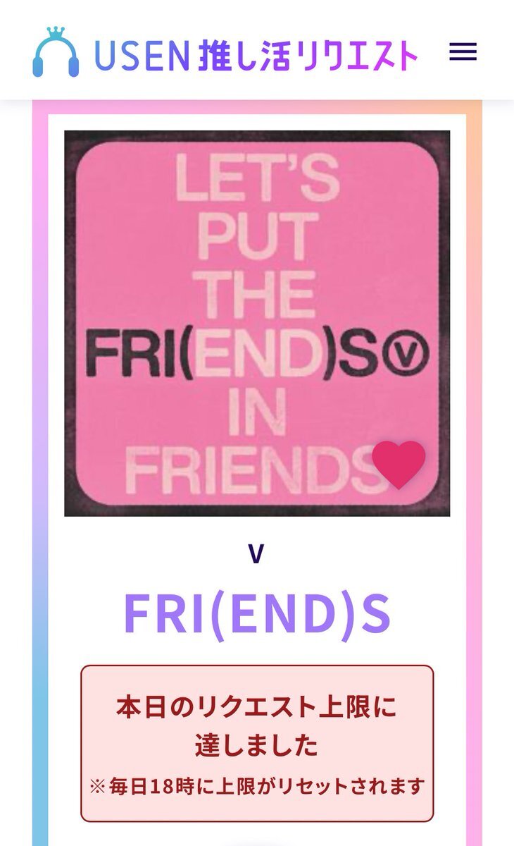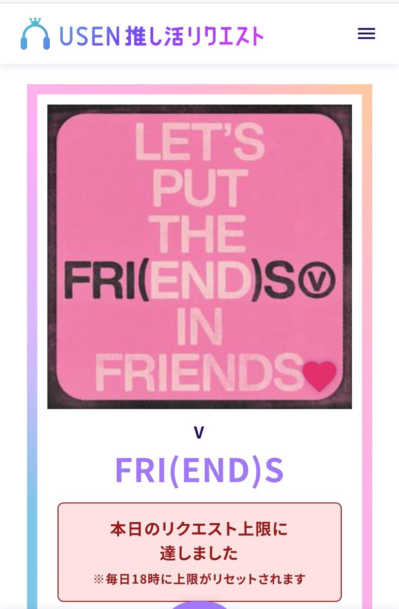 USEN 推し活リクエストでVのFRI(END)Sをリクエストしました🩷🐻! usen.oshireq.com/song/6374660 #USEN推し活リクエスト #推しリク #V