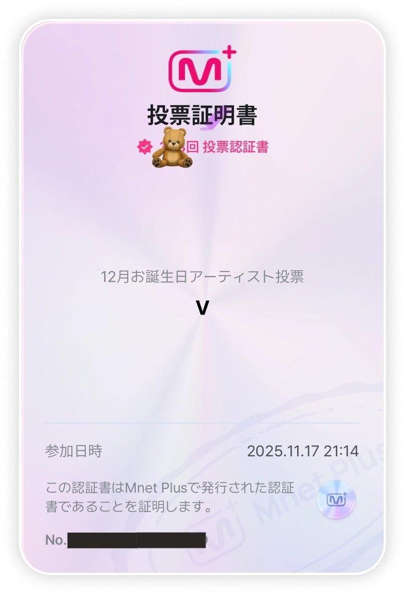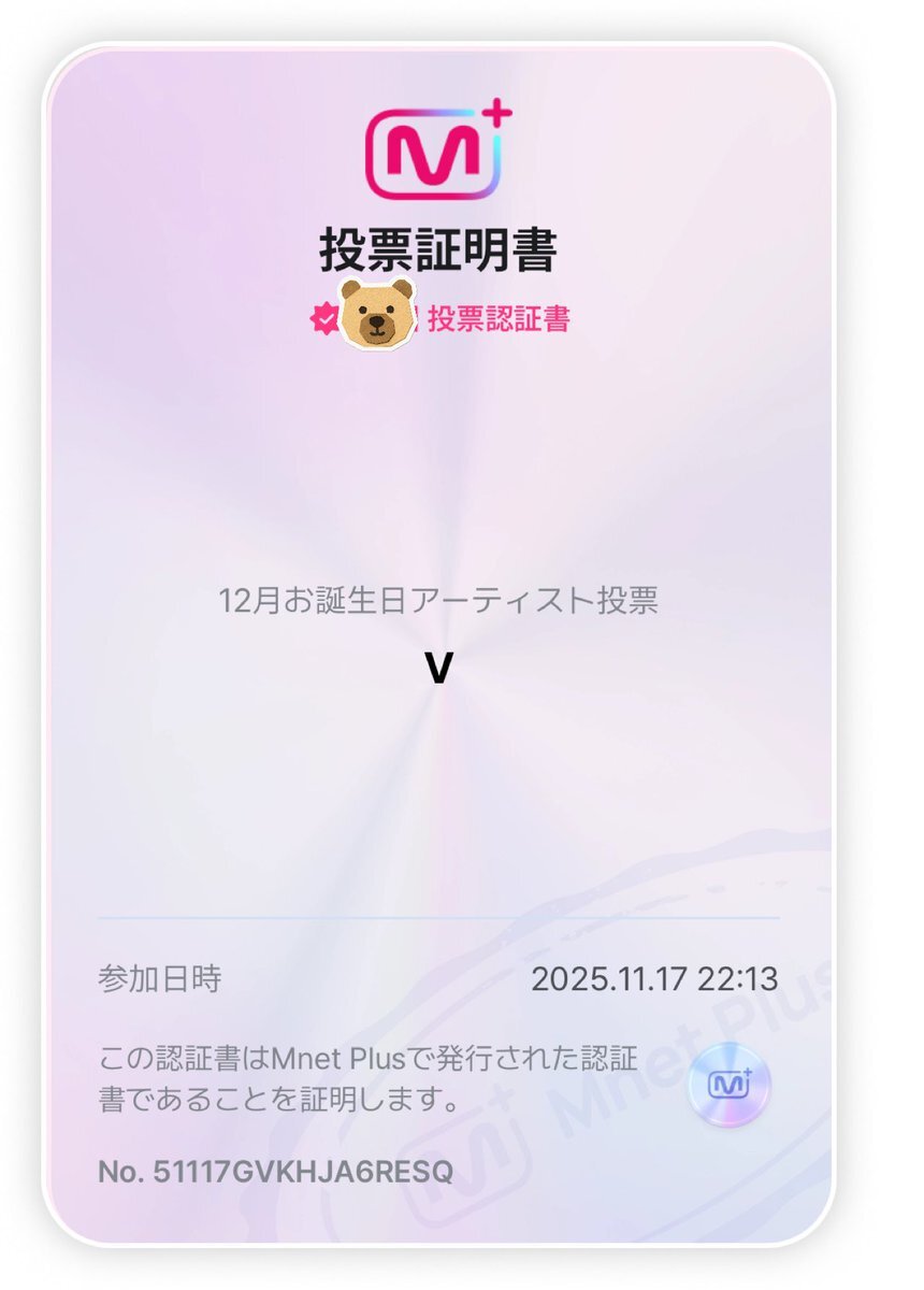 返信先:@taetaevoting_jp【Mnet】 ✔️11/24 🔚 🎂12月お誕生日アーティスト投票 #V テテには投票しました🧸🗳️ pic.x.com/M1wTWk83a1