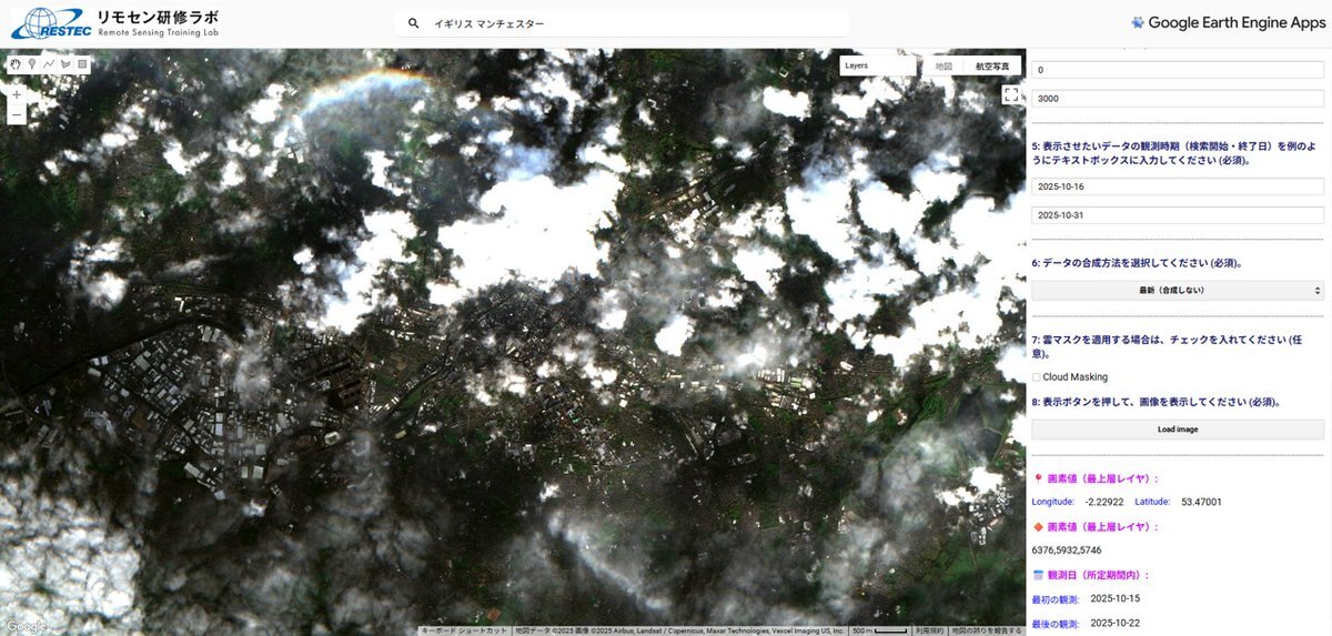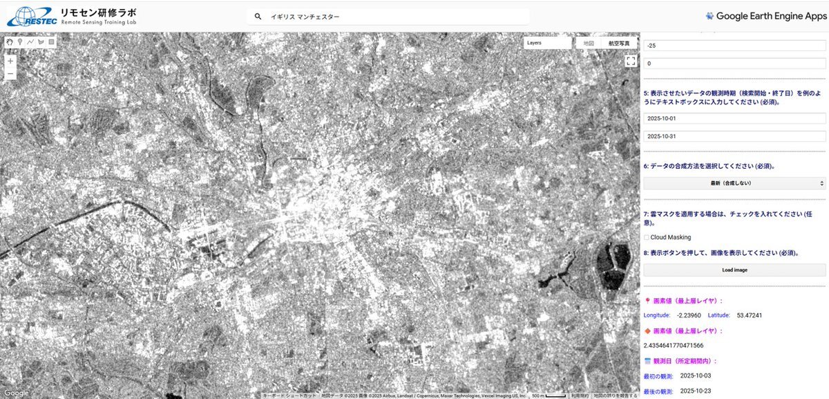 #oasislive25 チケット持っていらっしゃる方、週末は楽しんできてください! 彼らはもう来日しているでしょうけど、マンチェスターを #VEGA で見てみました。光学画像は雲が見えますが、SAR画像は雲を透過します。 pic.x.com/1COF52YNcJ