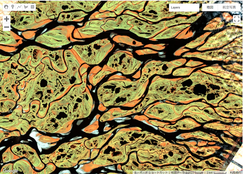 第1位はロシアのレナ川です。河口は一見グロテスクな様相で、取りつかれたように見入ってしまいます。 これらの画像は #VEGA(固定ツイート参照)で可視化しました。 バンドは近赤外と短波長赤外の組合せ(B5-B6-B7) レナ川以外は2022年の画像を雲マスクし、中間値を取っています。 pic.x.com/1sZjkyyIFx