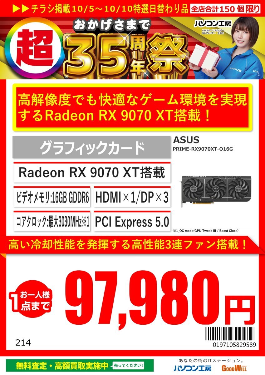 \🎊#超35周年祭🎉/を開催中! 本日のお勧めはこちら! #ASUS PRIME-RX9070XT-O16G #RX9070XT が10/10までお買い得になって販売中! 高性能GPUと大容量VRAM搭載 ゲームを快適にプレイしたい方にオススメです‼ #セール #VGA #ゲーム環境 #パソコン工房 #グッドウィル #山口 #宇部 pic.x.com/yEs98un9h5