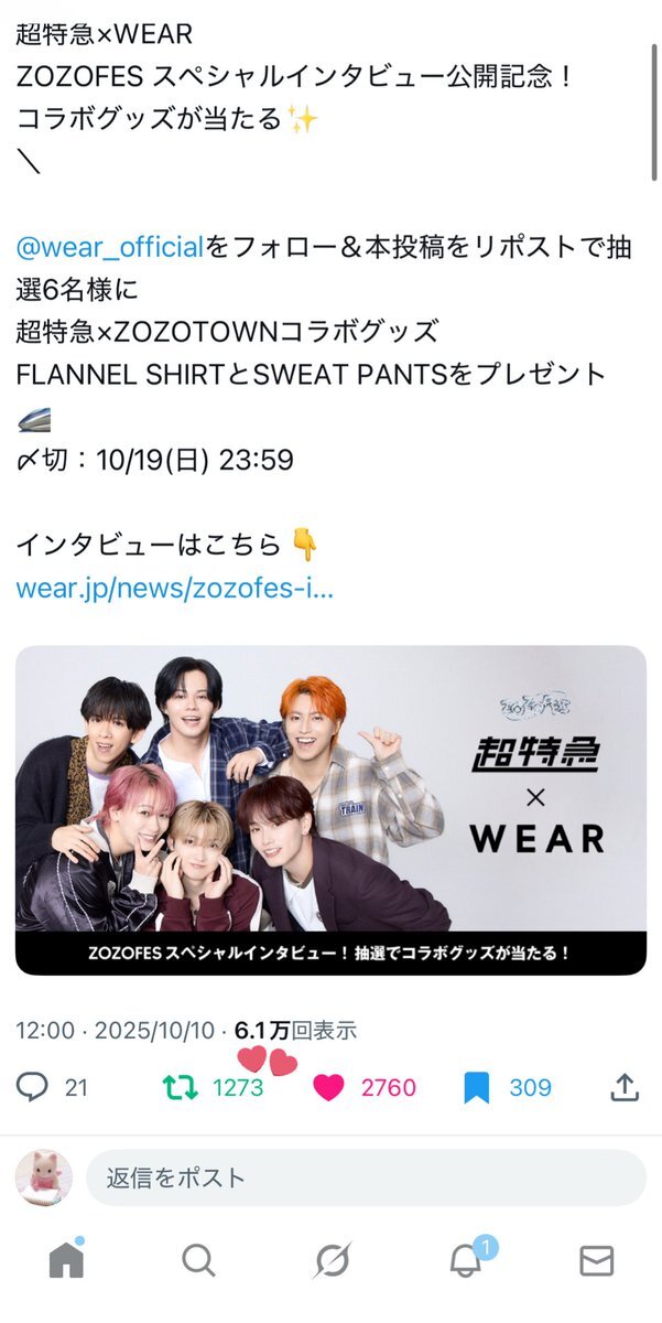 返信先:@wear_official#WEAR 様🎀 この度は、 #超特急 との素敵なコラボやプレゼント企画、インタビューをありがとうございます🥹💞 タカシくんの優しさ溢れる言葉にキュンとしましたᐡ⸝⸝> ̫ <⸝⸝ᐡ💘💭ྀི 自分の好きを貫いて生きるタカシくんが大好きです🫶🏻💕 フォロー並びにRP済みです🔁✨ ご縁がありますように🍀🫧 pic.x.com/0B6968PVZR