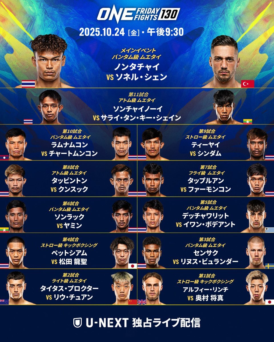 ◤⚡️#ONEFridayFights130 対戦カード⚡️◢ 今週金曜に開催する #ONEフライデーファイツ の全対戦カードがこちら! 松田龍聖 & 奥村将真がONE初参戦🎌🔥 ✅ U-NEXTで独占ライブ配信をお見逃しなく👉 bit.ly/OFF130_UNEXT 🗓 10月24日 午後9時30分 | #WeAreONE #ONEチャンピオンシップ pic.x.com/EOj1KfzGtf