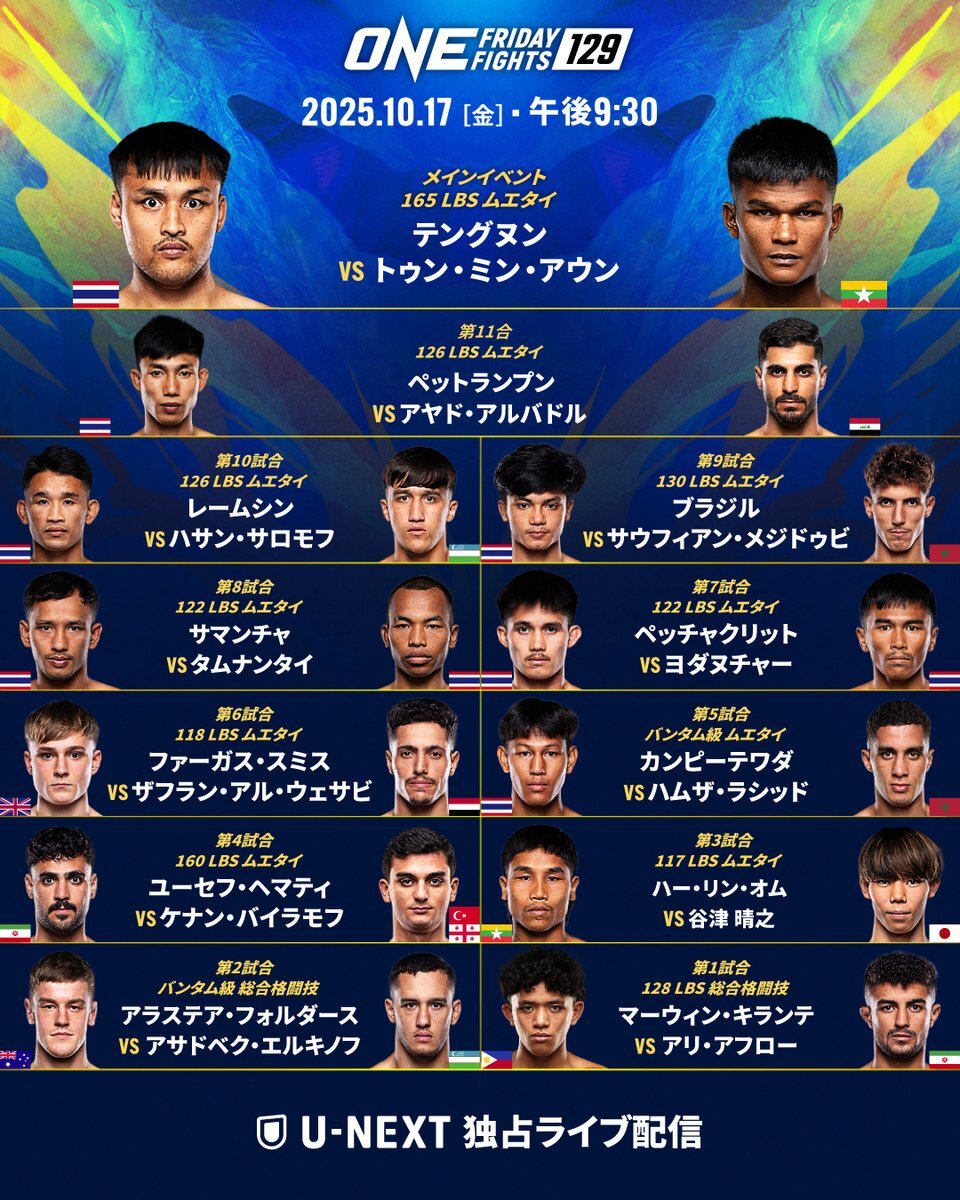 ◤⚡️ 今夜の対戦カード⚡️◢ 今夜に開催する #ONEフライデーファイツ の全対戦カードがこちら! 日本から谷津晴之が参戦🎌🔥 ✅ #ONEFridayFights129 はU-NEXTで独占ライブ配信をお見逃しなく👉 bit.ly/OFF129_UNEXT 🗓 10月17日 午後9時30分 | @tatsumitsu13 #WeAreONE #ONEチャンピオンシップ