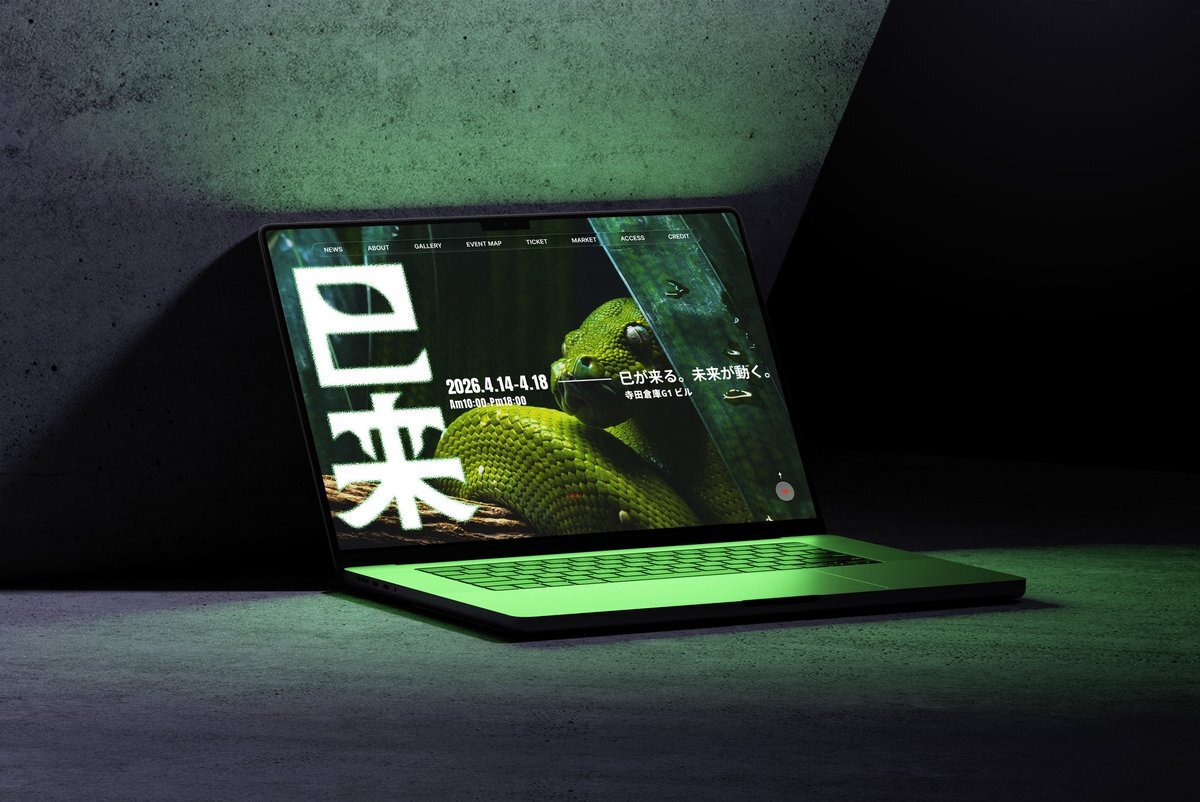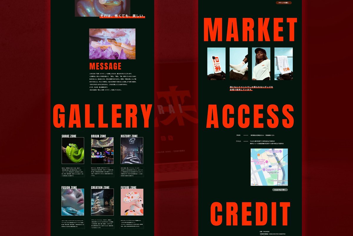 架空のイベントサイトのデザイン 世界中の巴び(ヘビ)を展示、巴からインスピレーションを受けたモーショングラフィック、様々な媒体のデザインを鑑賞、体験出来るイベント━━━━━━━━ 巴来 - MIRAI - #Website #webdesign #Web制作 #Figma pic.x.com/gOQKkrmZIn