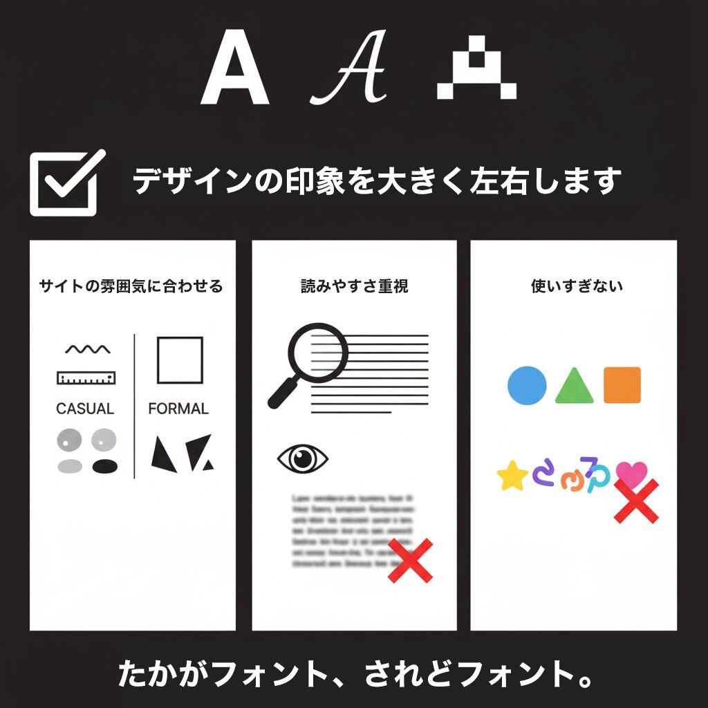 サイトに合うフォント選びは、デザインの印象を大きく左右します サイトの雰囲気に合わせる:カジュアルか、フォーマルか。ターゲット層も考慮しよう! 読みやすさ重視:特に本文は、どんな環境でも読みやすいシンプルなフォントを選んで 使いすぎない:2〜3種類に絞ると統一感が出ます #webdesign pic.x.com/VBn6dlHP69