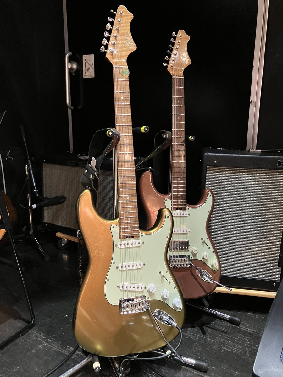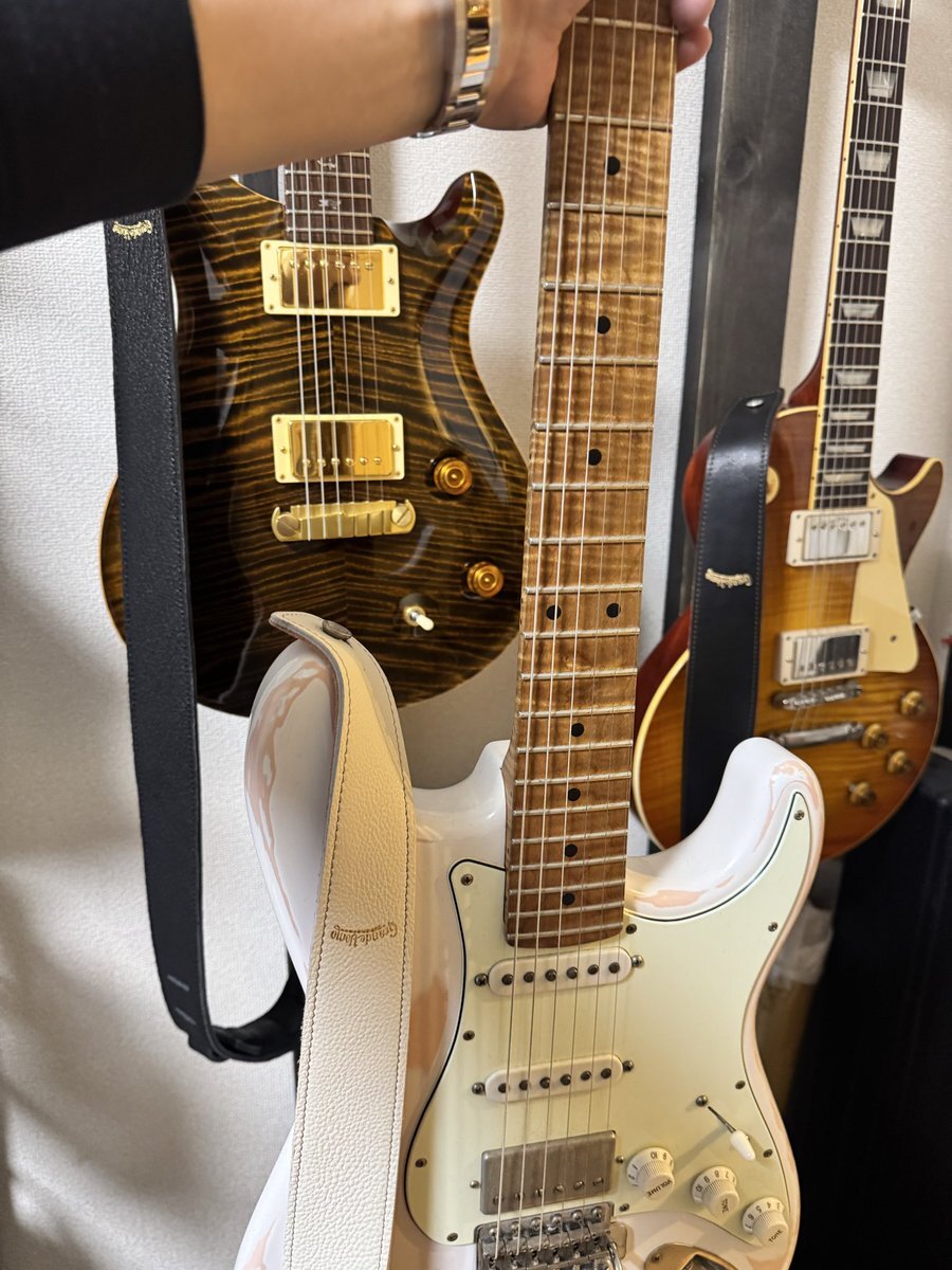 手持ちギター 全部Grande uomo製ストラップ搭載完了…! 全部違う革になった。笑 革も、ギターも一生物、どちらも育てていこう。 安田さん、お忙しい中にも関わらずありがとうございました! #ギター #ギターストラップ #ストラップ #prs #gibson #xotic pic.x.com/2jS9UwETEB