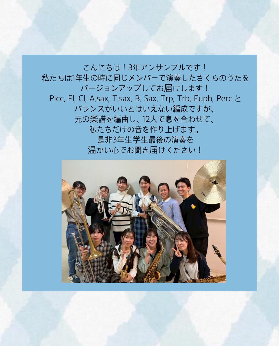 【定演まであと7日】 吹奏楽団「奏」です! 本日は3年生によるアンサンブルを紹介します!🎶 お知らせ📢 定期演奏会 12/27(土) 13:00開場 13:30開演 会場 港南公会堂 入場無料です!ぜひおこしください✨ #横浜市立大学 #ycu #吹奏楽 pic.x.com/ZPUO0yD1NG