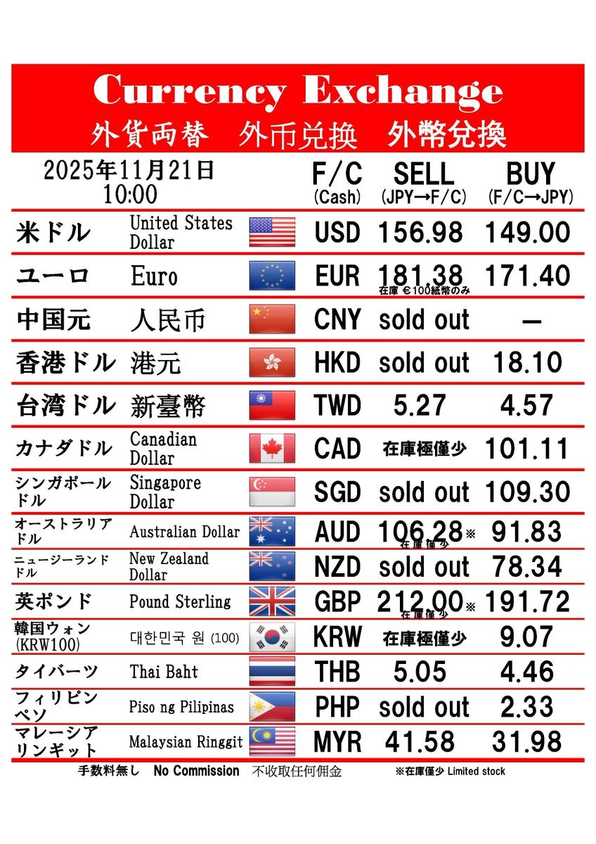 おはようございます #外貨両替フラッグスタッフ です 2025年11月21日(金)の両替レートです Skypeサービス終了に伴い「050-5539-9999」の提供が終了しました 今後は eメール info@flagstaff.co.jpにてお問い合わせ願います 宜しくお願い致します #横浜 #中華街 #海外旅行 #外貨両替 #exchange #yokohama pic.x.com/aRxig6fNq4