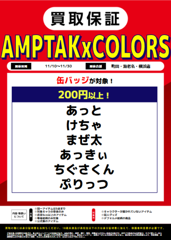 【#らしんばん横浜店/買取情報】 / 当店では‼ 📢「#AMPTAKxCOLORS(#アンプタックカラーズ)」 の買取保証を実施中❣ \ 開催期間:11/10~11/30 期間中に対象商品を仕分けてお持ち込みいただくと‼ 下記、買取保証金額でお買取り致します‼是非、ご利用ください🎶 #yokohama pic.x.com/iSllHNtZap