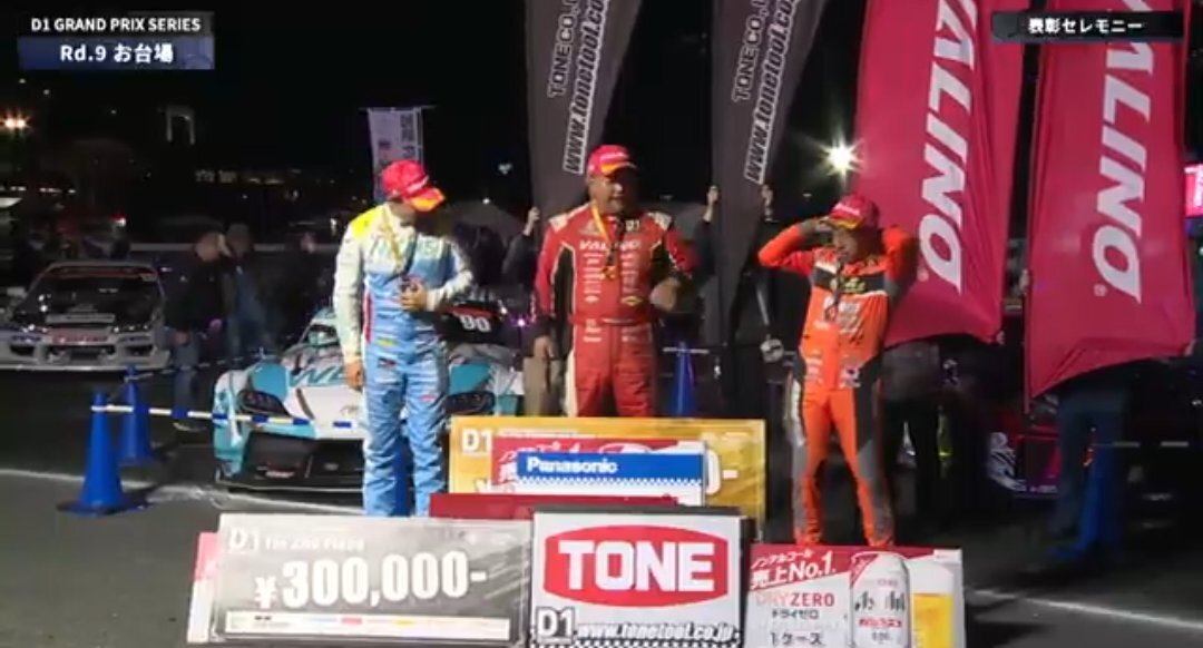 今日はヴァリヴァリな表彰台となりました。 明日はシバシバ⚡️⚡️かな? トヨトヨかな? ヨコヨコかな? ダンダンかな? #VALINO #シバタイヤ #TOYO #YOKOHAMA #DUNLOP #D1GP #TOKYODRIFT pic.x.com/m0vO7AATu5