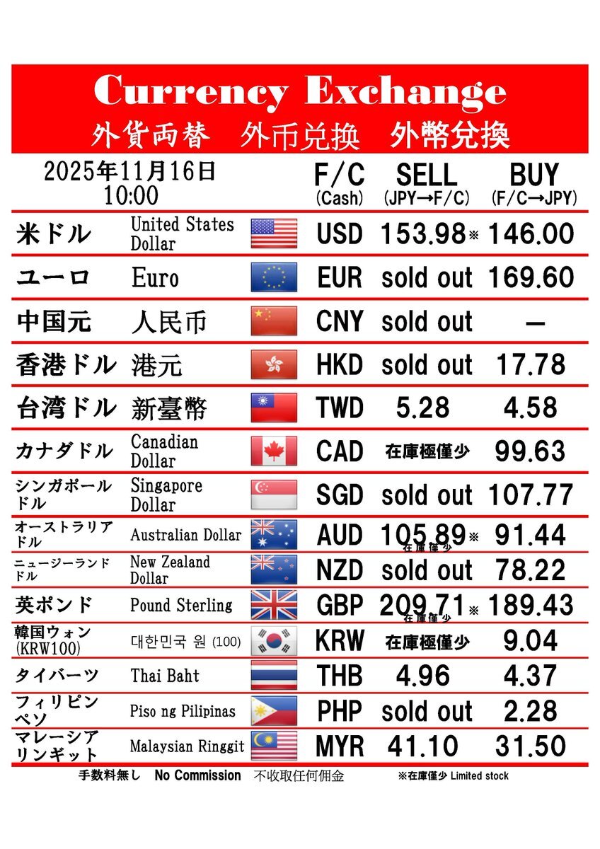 おはようございます #外貨両替フラッグスタッフ です 2025年11月16日(日) の両替レートです Skypeサービス終了に伴い050-5539-9999の提供が終了しました 今後は eメール info@flagstaff.co.jp へお問い合わせ願います 宜しくお願い致します #横浜 #中華街 #海外旅行 #外貨両替 #exchange #yokohama pic.x.com/sVI8bI0FaE