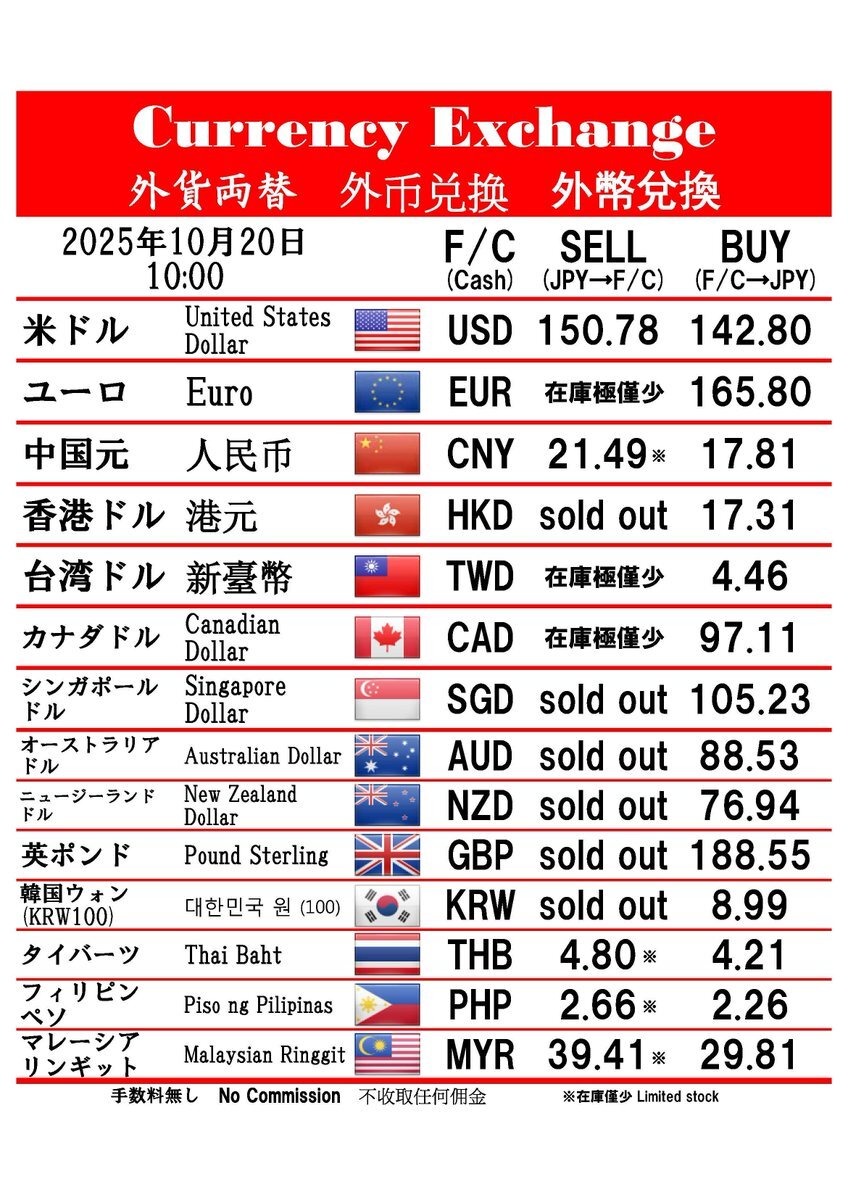 おはようございます #外貨両替フラッグスタッフ です 2025年10月20日(月)の両替レートです Skypeサービス終了に伴い「050-5539-9999」の提供が終了しました 今後は eメール info@flagstaff.co.jpにてお問い合わせ願います 宜しくお願い致します #横浜 #中華街 #海外旅行 #外貨両替 #exchange #yokohama pic.x.com/W4DNkJog6y