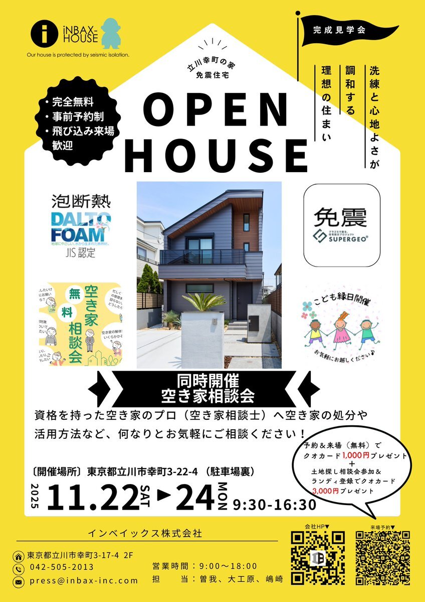 今月も開催!#オープンハウス🏠✨ なんと今回は11月22日(土)〜24日(月)の3日間リラ~ 【高気密・高断熱の #ZEH 仕様× #免震 工法】を用いたハイグレード住宅! 空き家相談士による、空き家活用や処分についての相談会も開催! 詳細はこちら⇩ h1um6.hp.peraichi.com/?_gl=1*10qd686… #立川 #空き家 #新築戸建て pic.x.com/9iTAPsHDJb