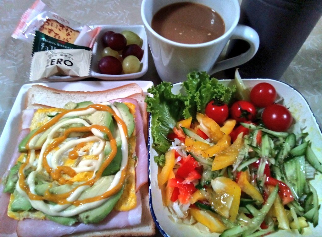 サンドの開き(蓋🍞付)にゃ昼飯~ #味わい食パン*2 +ロースハム・ウズラ卵(レンチン)・アボカド +マヨマスタード 5種野菜サラダ~ コーヒー+#キークリーミー 葡萄 #ZERO #チョコレート効果 #ちいさなかすていら 620k強 #昼ご飯 #昼ごはん #昼食 #ヤマザキ #ロッテ #明治 #ブルボン pic.x.com/NN0yCL4NkB