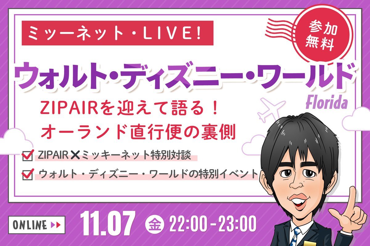 【11月7日(金)ミッキーネット・LIVE!】 ZIPAIRを迎えて語る「オーランド直行便の裏側」✈️ 今回のライブは、成田からオーランドへーー夢の直行便が生まれるまでの舞台裏を、オーランド本社と中継で生配信。ぜひ、お見逃しなく! 📅日時 11月7日(金)日本時間午後10時〜