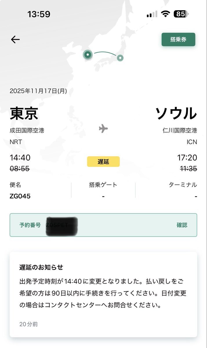 zip Air 前日の昼にこれかよ、遅延の理由くらい教えろよ。 仁川から乗り換えの人には厳しくないか? 今から他の航空券買うの辛いだろうし。 #ZIPAIR #ソウル線遅延 pic.x.com/vPCGqsOsXi