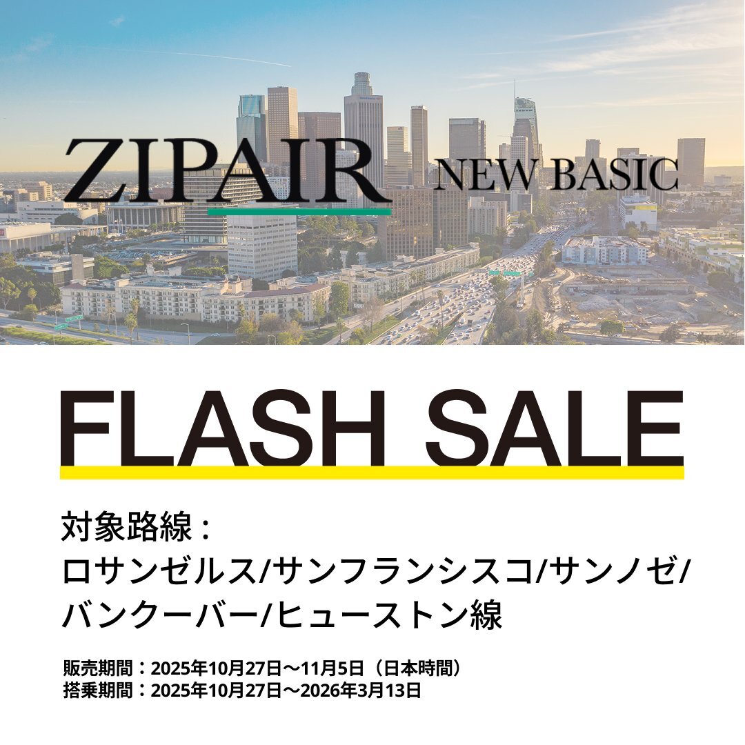 ✨ ZIPAIRフラッシュセール開催中! ✨     【🗽北米編🗽】 🌴ロサンゼルス 29,250円~ 🌉サンフランシスコ 32,500円~ 🛩️サンノゼ 32,500円~ 🚀ヒューストン 39,000円~ 🍁バンクーバー 28,950円~ 販売期間:10月27日(月)~11月5日(水)まで! 今すぐチェックして、夢の旅へGO!🌟✈️