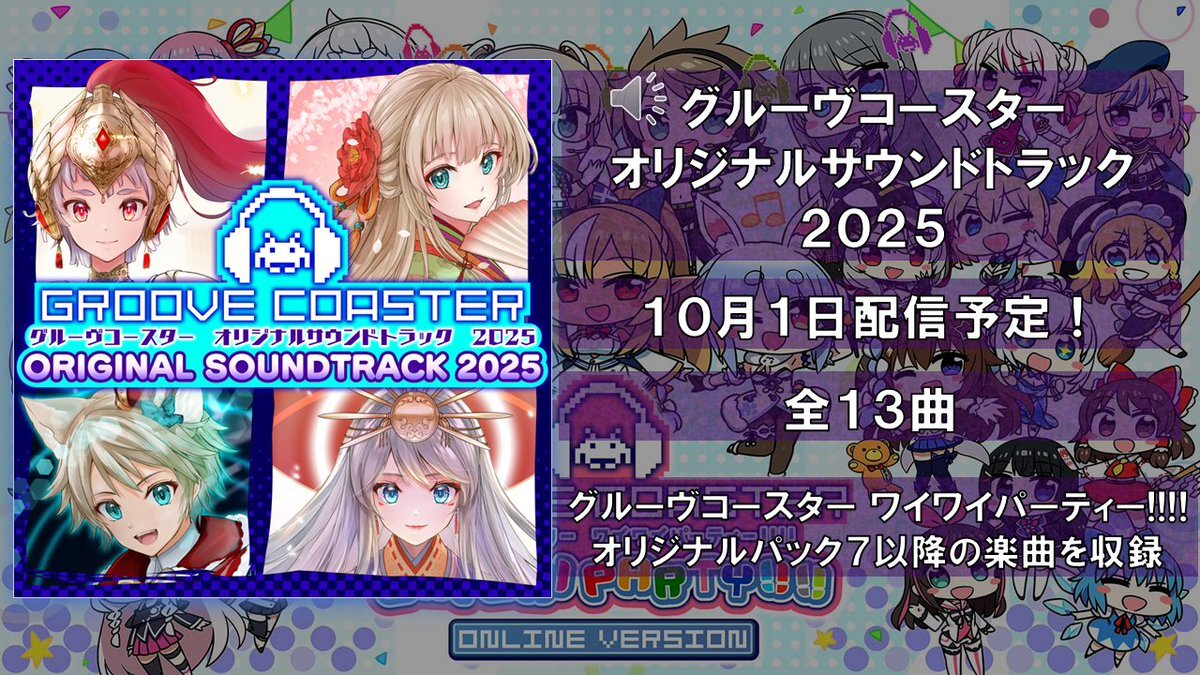 #グルコス 】『グルーヴコースター オリジナルサウンドトラック2025』が10月1日に配信決定! 『グルーヴコースター ワイワイパーティー!!!!』のDLC「オリジナルパック7」以降に収録されていた楽曲を13曲収録! #zuntata pic.x.com/5tgMzNQhw2