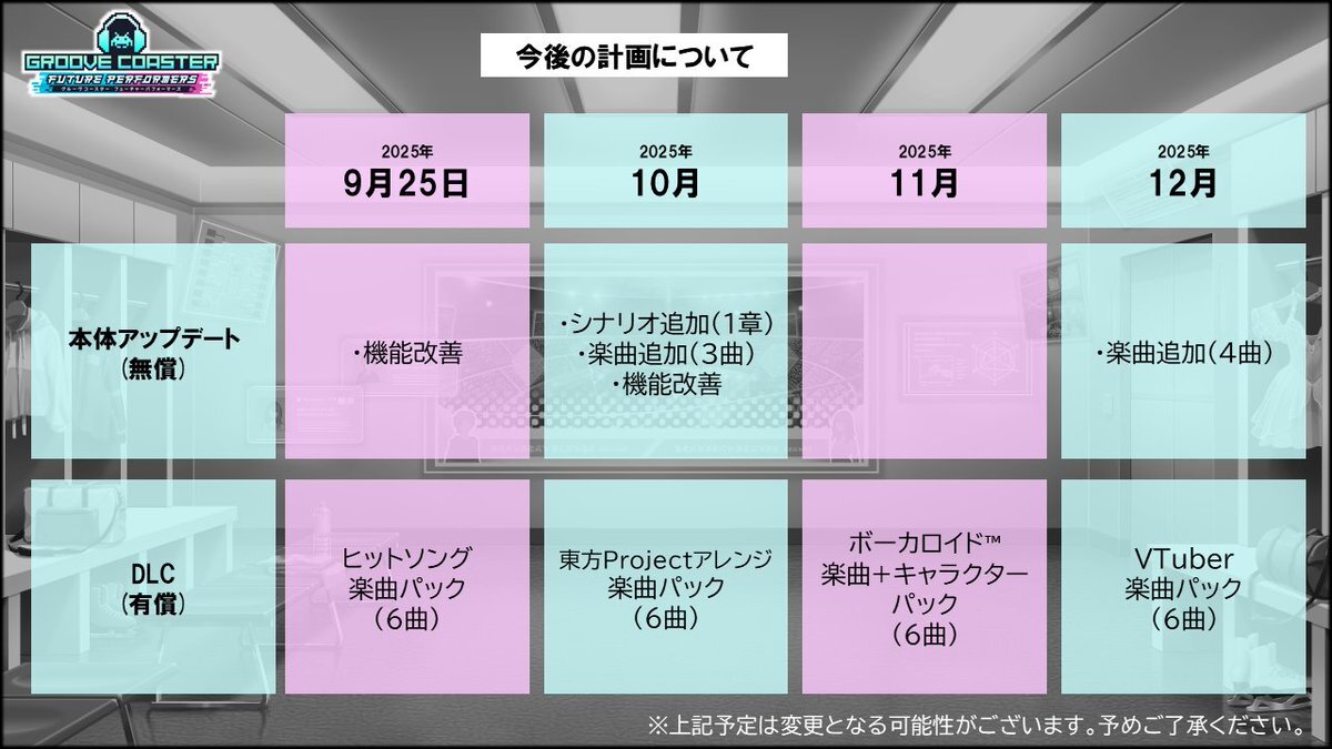 #グルコスFP 】『グルーヴコースター フューチャーパフォーマーズ』の今後の計画はこちら!毎月様々なジャンルのDLCを配信し、さらに本体の無料アップデートで楽曲や追加シナリオを配信予定となります。また10月にも機能追加、改善のアップデートを予定しております。 #zuntata #グルコス pic.x.com/khDZD8GZfE