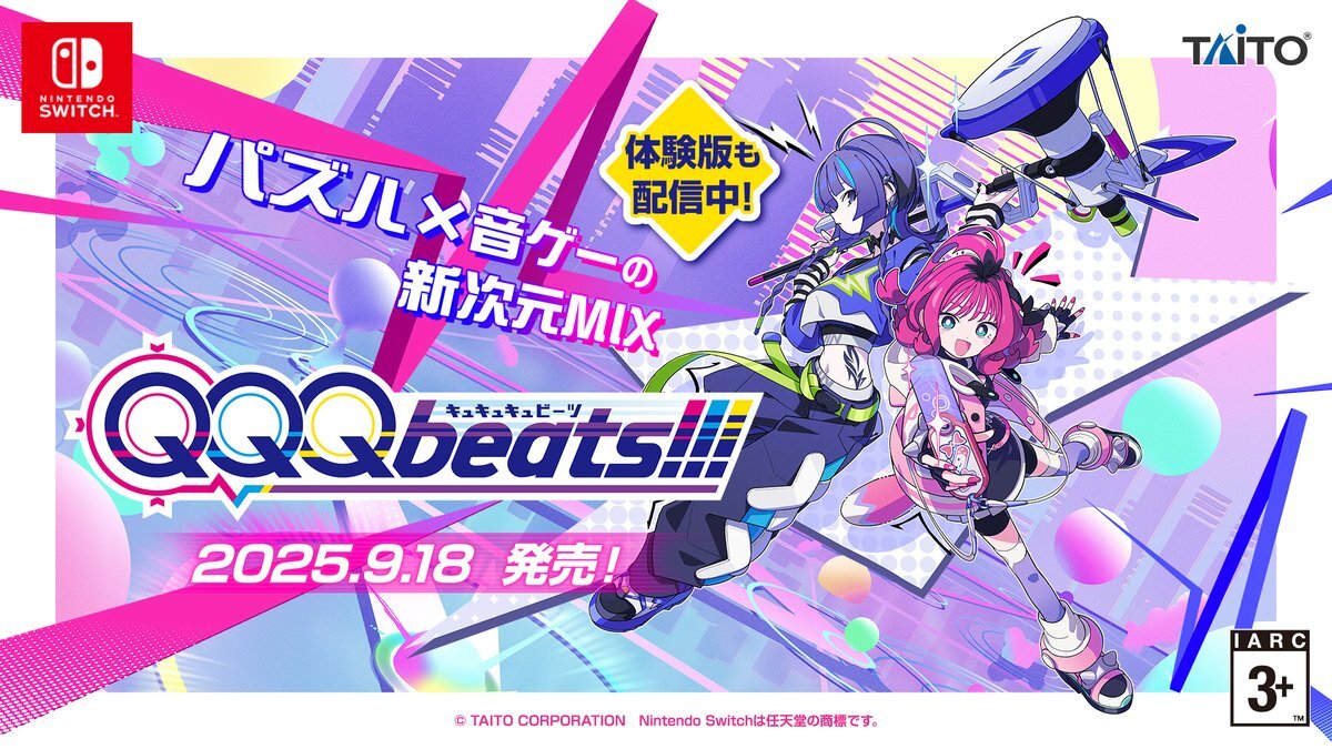 ◤ #本日発売 ◢ 🎮Nintendo Switch™パズル×音ゲーの新次元MIX 『QQQbeats!!!』本日9月18日発売! さらに、9月25日・10月2日の2週連続でヒットソング&バーチャルソングの追加DLCも発売決定! パズルとリズムの融合をぜひお楽しみください✨ ▼詳しくはコチラ taito.co.jp/mob/topics/469… #QQQb