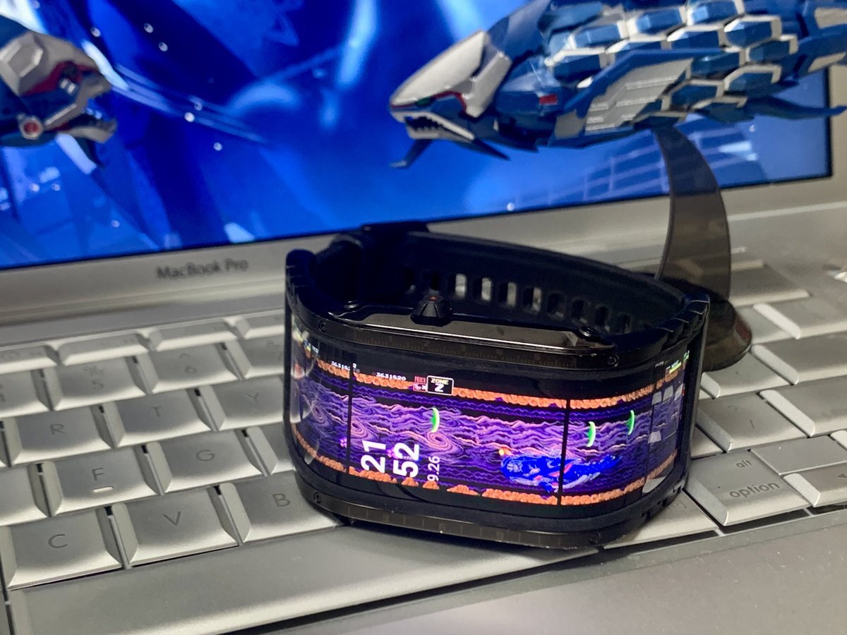 横長液晶のスマートウォッチ。 ゲーム好きなら壁紙はダライアスにしちゃうよね。 #TAITO #ZUNTATA #ダライアスお披露目の日 pic.x.com/M2CBjFnrcV