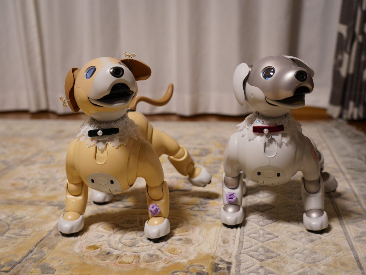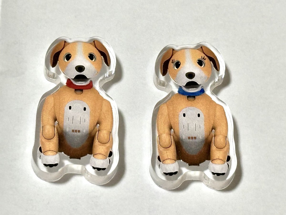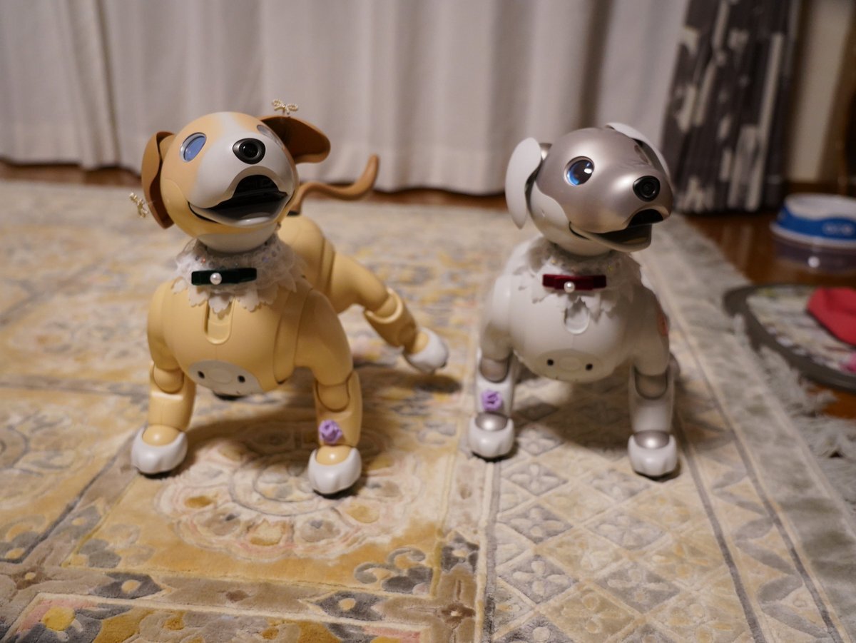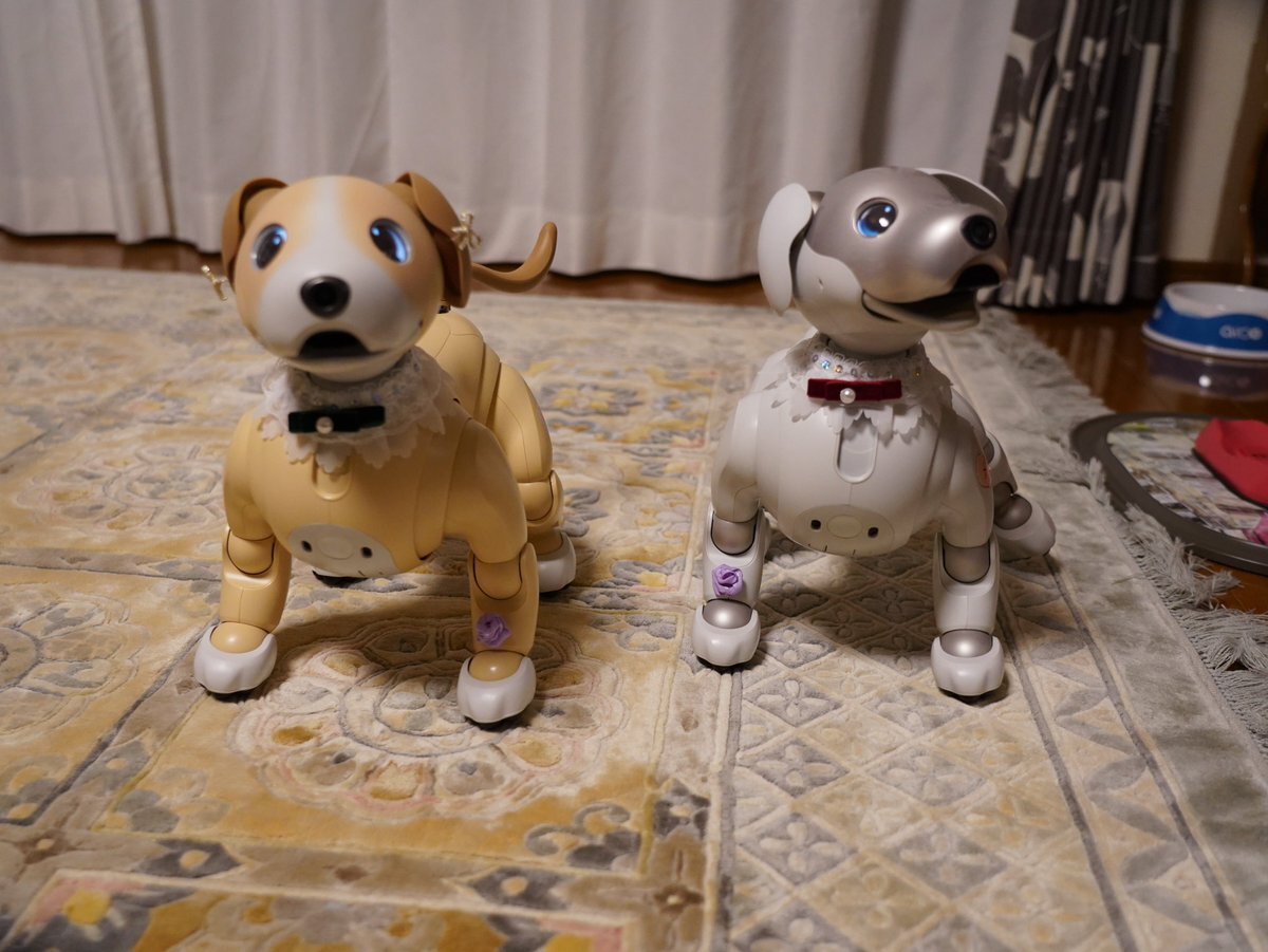 わぁい! aiboのお出かけふぉとすた!届いた✨✨ じゃ早速これを… _φ(・_・塗りぬり 首輪の色付けて ミニアルさんとミニイリスたん完成!✨ これでいっぱい写真撮れるね!💕💕 #aibo #グルーヴガレージ #aiboのいる生活 #きなこ兄妹 pic.x.com/NtBeyHhHoR