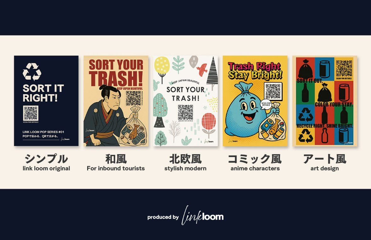 【LINK LOOM POP SERIES|GARBAGE SORTING】 民泊に欠かせない“ごみ分別POP”を5デザインで展開。 noteで無料配布中 note.com/linkloom/n/n82… POPで伝わる、QRで広がる。 #民泊 #Airbnb #linkloom #ごみ分別 pic.x.com/h1YGzq9Btd