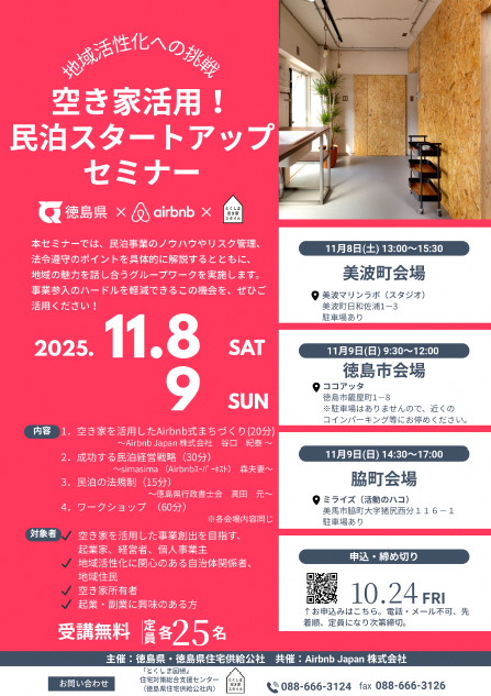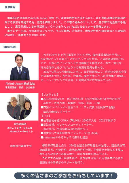【空き家活用で地域貢献!】 徳島県×Airbnb×とくしま空き家スタイル共催の民泊セミナーを11/8(土)・9(日)開催! 運営ノウハウからリスク管理まで解説します 詳細・申込はこちら tokushima-akiya.jp/m/ #空き家活用 #民泊 #徳島 #Airbnb pic.x.com/9ZttoJshOT
