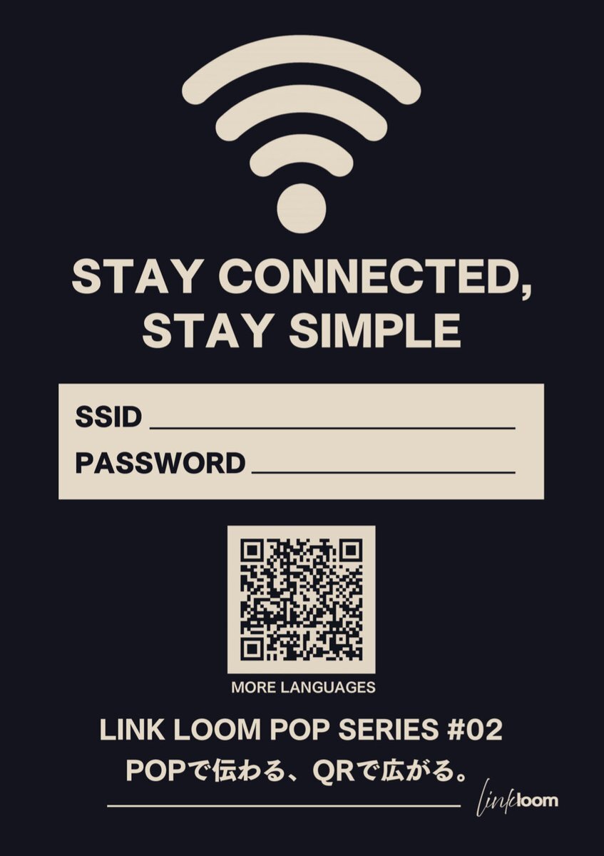 LINK LOOM POP SERIES #02 「STAY CONNECTED, STAY SIMPLE」 Wi-Fi情報を、もっとスマートに! シンプルなデザインでSSIDもQRも一目で伝わる。 POPで伝わる、QRで広がる。 #民泊 #Airbnb #linkloom #WiFi #民泊POP pic.x.com/guMLPMo5gY