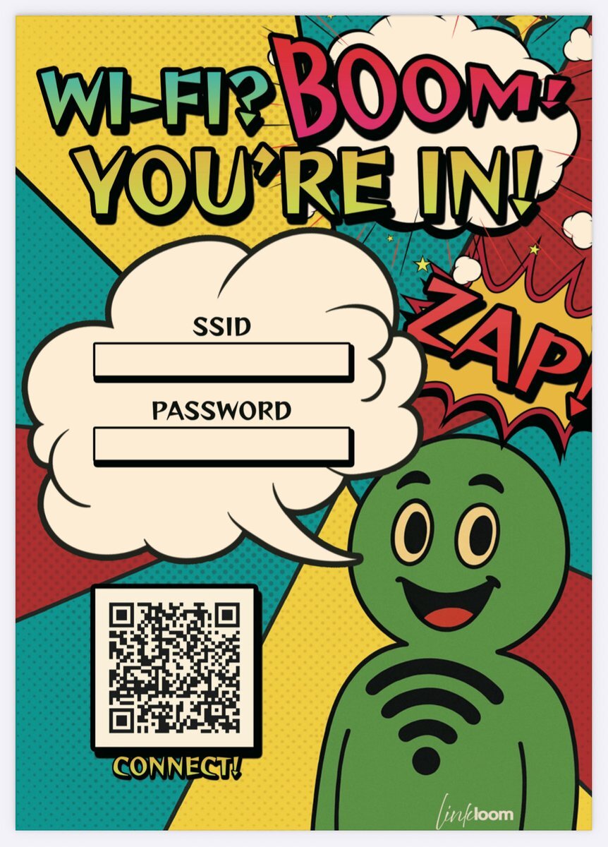 LINK LOOM POP SERIES / comic style 「Wi-Fi? BOOM! YOU’RE IN!」⚡️ SSIDもQRも一目で伝わる、アメコミ調POP。 遊び心で、チェックインをちょっと楽しく。 ポイントはWi-Fiマン! POPで伝わる、QRで広がる。 #民泊 #Airbnb #linkloom #民泊POP pic.x.com/aiVUJ3cV8R