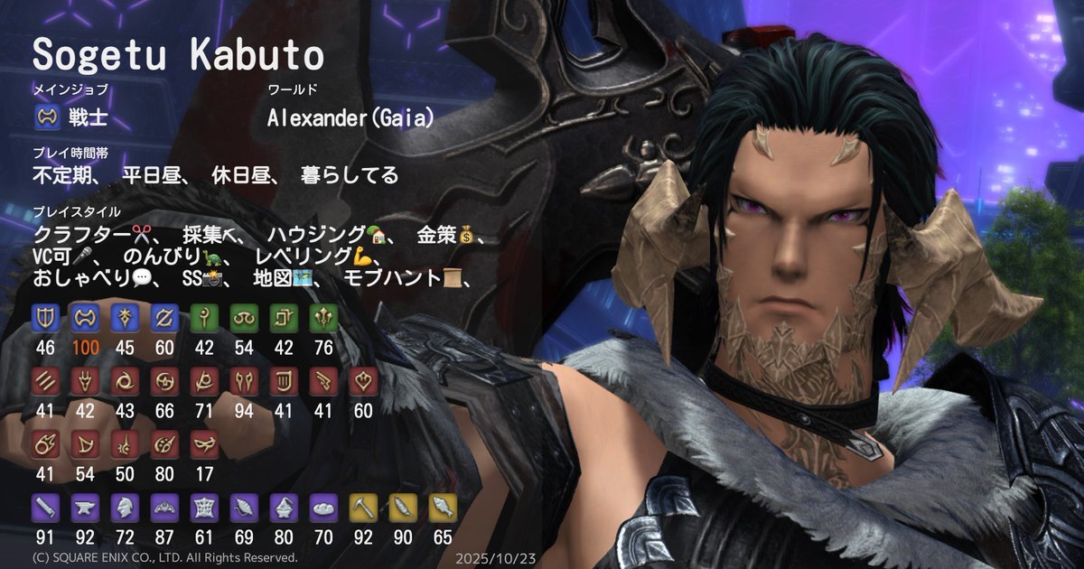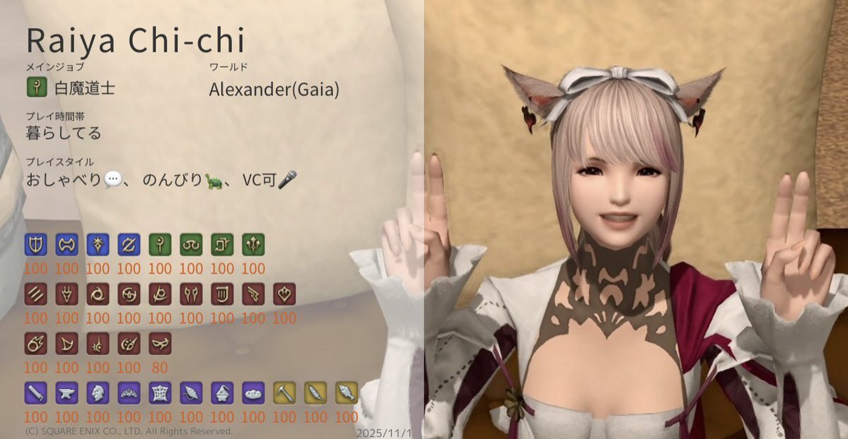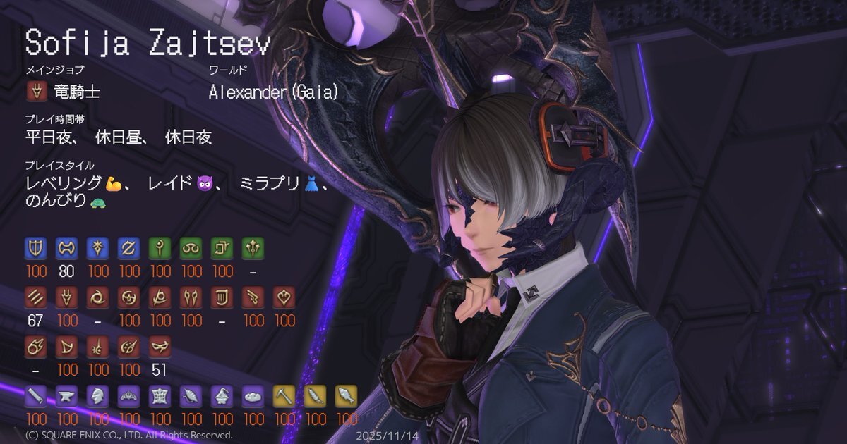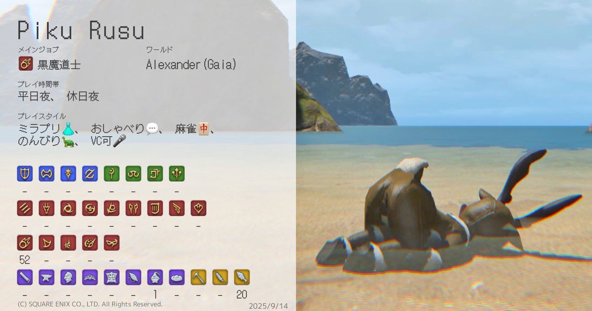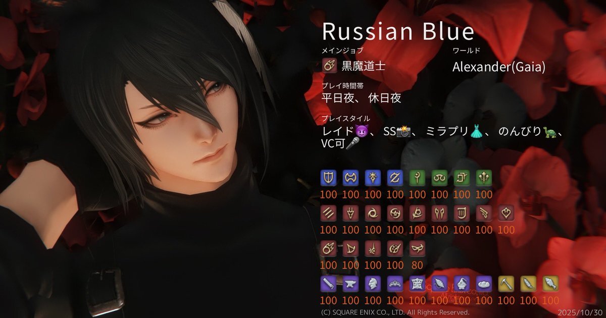 ド深夜に投下🐈⬛ 基本ぼっちで遊んでるので、一緒に遊んでくれるフレンドさんほしいです🥺 周回とかお店やスタジオ行ったりとか色々やりたい🥺 キャラカード?ないので、コンパニオンアプリの情報で失礼しますだ! #FF14 #GaiaDC #Alexander #FF14フレンド募集 #オスッテ pic.x.com/kLcancf2Ks