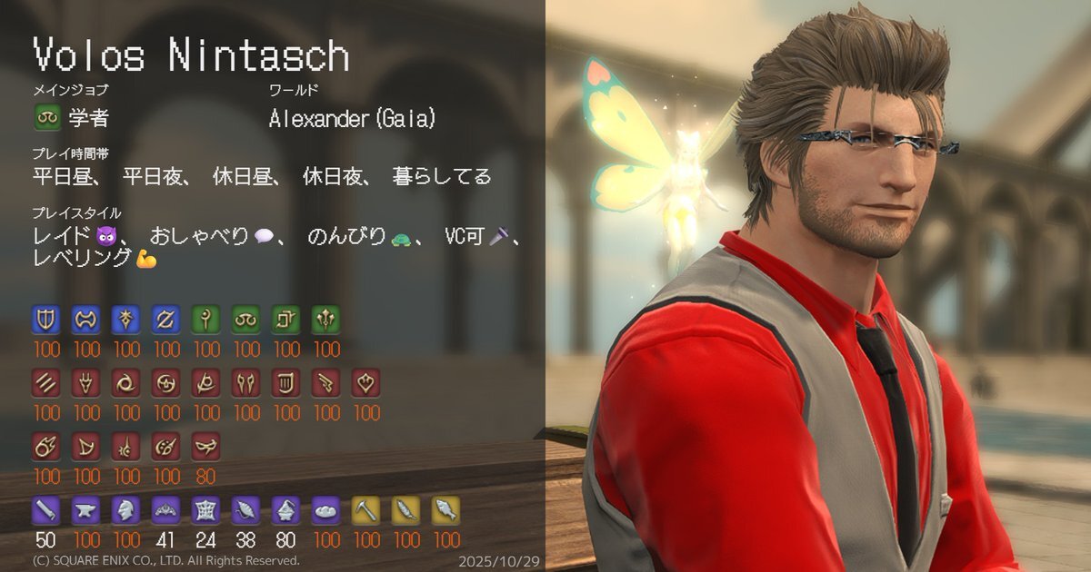 おじさんもキャラカとやらを作ってみんとす。 一通り戦闘ジョブは上がってるけど基本的には緑でBH(特に学者)がメインです! クラフター上げなきゃなぁ・・・ characa.kkimu.dev #キャラカ #FF14 #FF14キャラクターカード #GaiaDC #Alexander pic.x.com/OQJJl3zt8Y