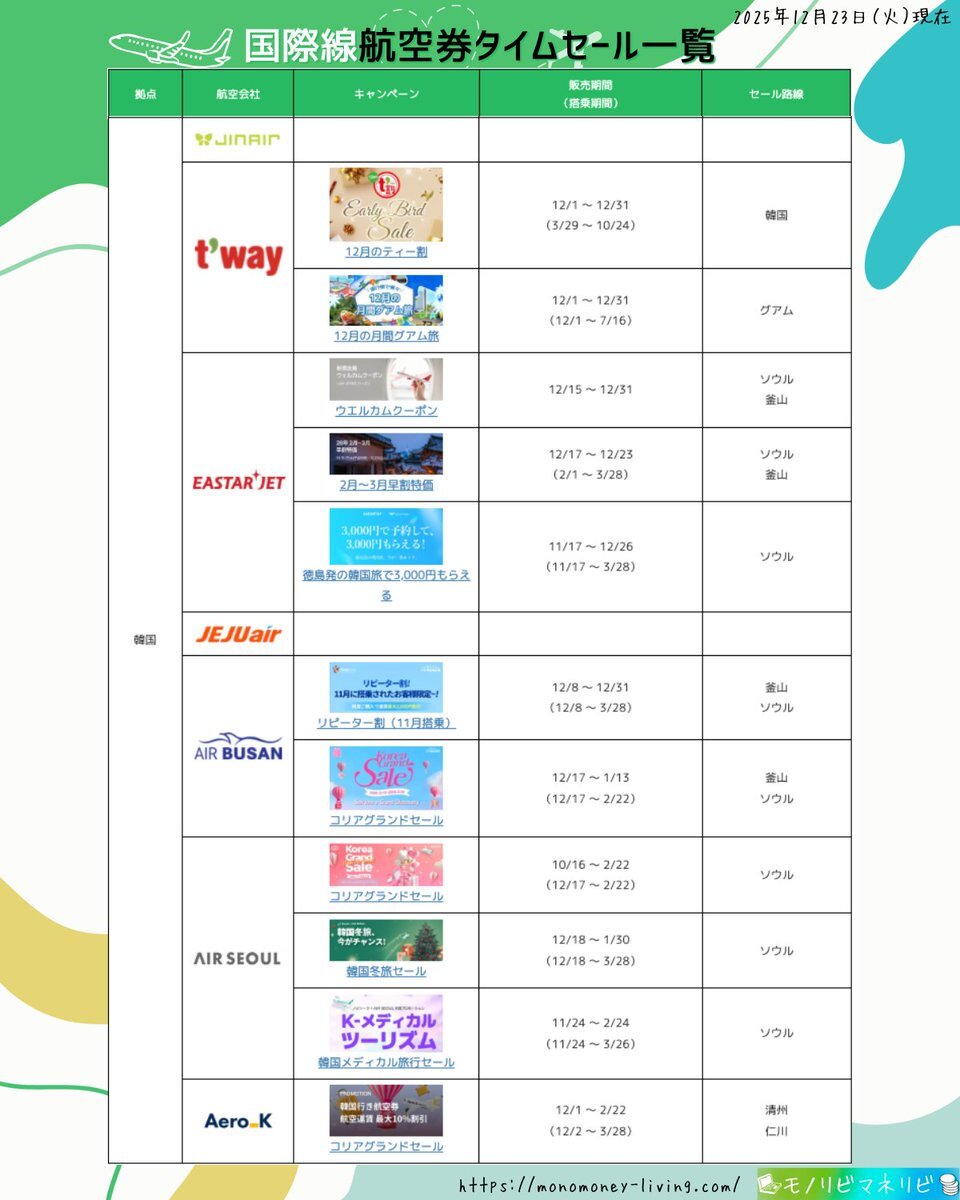 【2025年12月23日(火)】 🉐実施中の国際線航空券タイムセール一覧🛫 🔍詳細:monomoney-living.com/international-… #国際線航空券タイムセール一覧 #国際線航空券タイムセール #タイムセール #航空券 #JAL #ANA #ZIPAIR #AIRJAPAN #Jetstar #peach #AirAsia #AIRMACAU #HKexpress #tigerair #SINGAPOREAIRLINES pic.x.com/YTkGP1hlDC